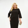 Стильное базовое черное платье от бренда «AXXA» О-образного силуэта, выполнено из качественной плательной ткани, что придает изделию определенную элегантность. В области низа спинки и полочки изделия расположены вытачки, благодаря которым силуэт платья принимает слегка зауженную форму. Спинка со средним швом. Сзади платье на потайной молнии. Горловина округлая типа лодочка. Рукав втачной одношовный, длина 3/4. В области груди платье декорировано съёмными цветами, что придает нежность и изящество данному изделию.