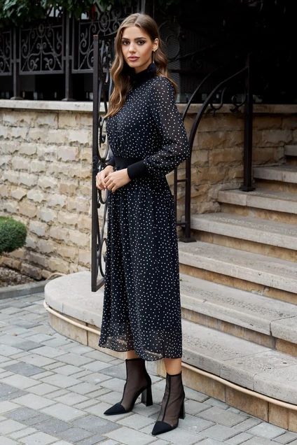 Платье из на подкладке выполнено из шифоновой ткани. Дизайн – популярный чёрно-белый горох. Отличный вариант как для повседневных, так и для выходных образов.