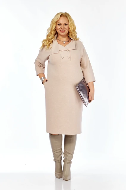 Женское платье прямого силуэта выполнено из трикотажного полотна под вельвет в мелкий рубчик.Перед с втачными планками по горловине и центральной застёжкой на 4 петли и пуговицы Воротник -стойка.Спинка цельная.Плечи спущены.Рукава одношовные длинной 3/4.