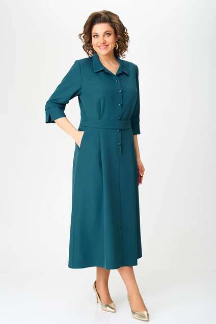Платье женское отрезное по линии талии. Верхняя часть платья по спинке цельная со складкой по талии. По переду с нагрудной вытачкой от проймы и складкой по талии. Нижняя часть платья (юбка) по спинке и переду со средним швом, глубокой складкой, формирующей приталенность по талии, и наклонными карманами от талии к боку. Застежка на притачную планку по полочке от горловины с переходом на юбку на 6 петель и пуговицы. Воротник втачной без стойки. Рукав втачной одношовный с притачной манжетой по низу и боковой складкой по ширине рукава. Дополнением к платью служит съемный пояс из основной ткани, который фиксируется по талии на пуговицы со стороны спинки.