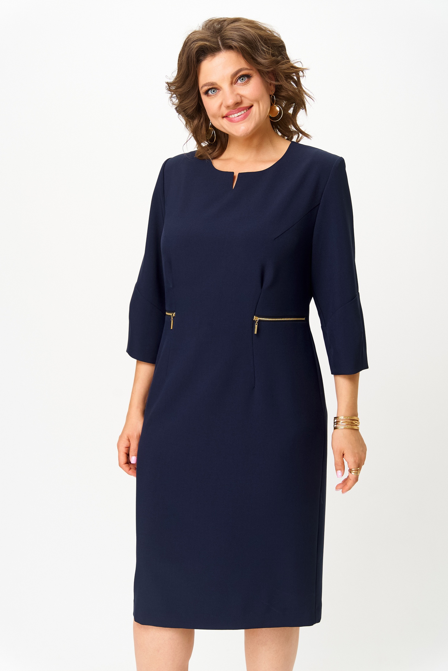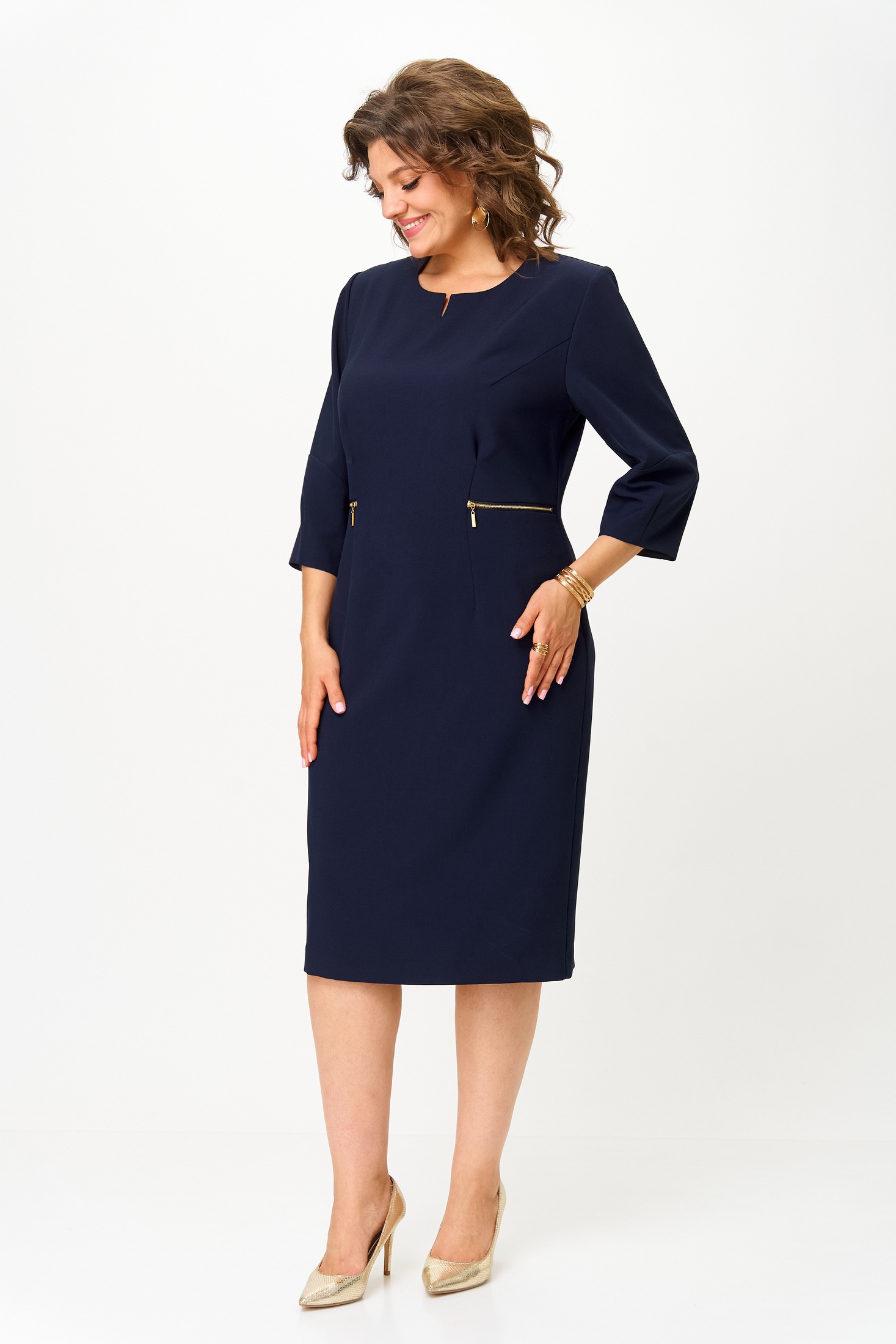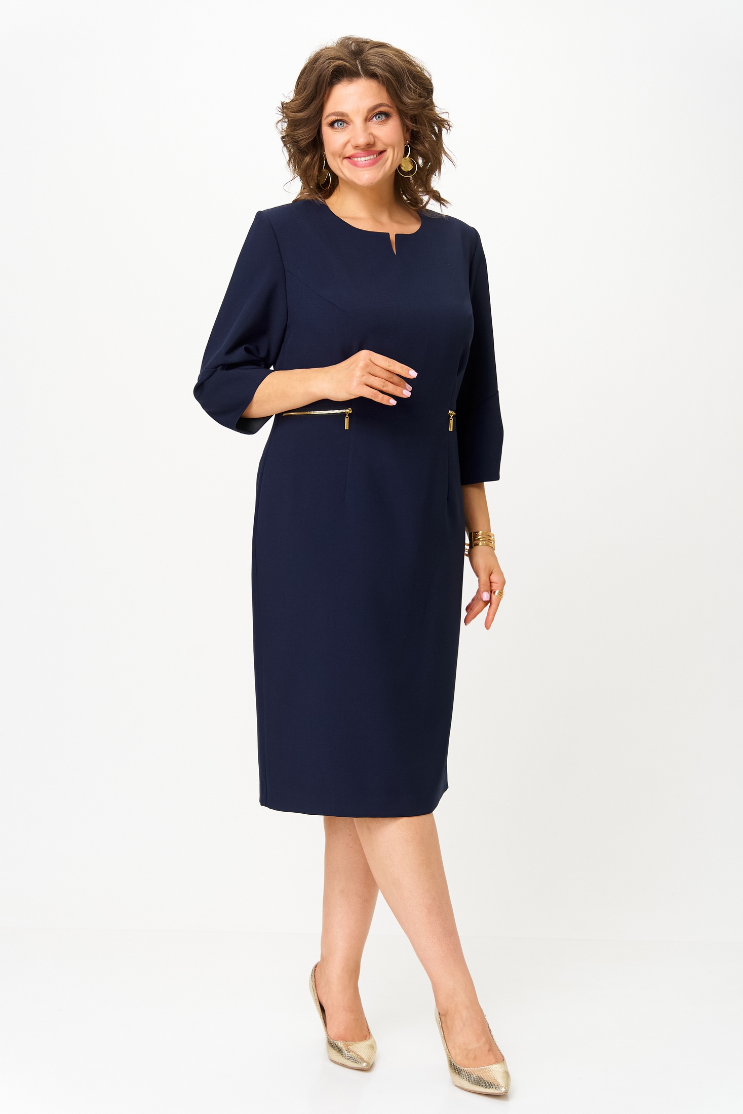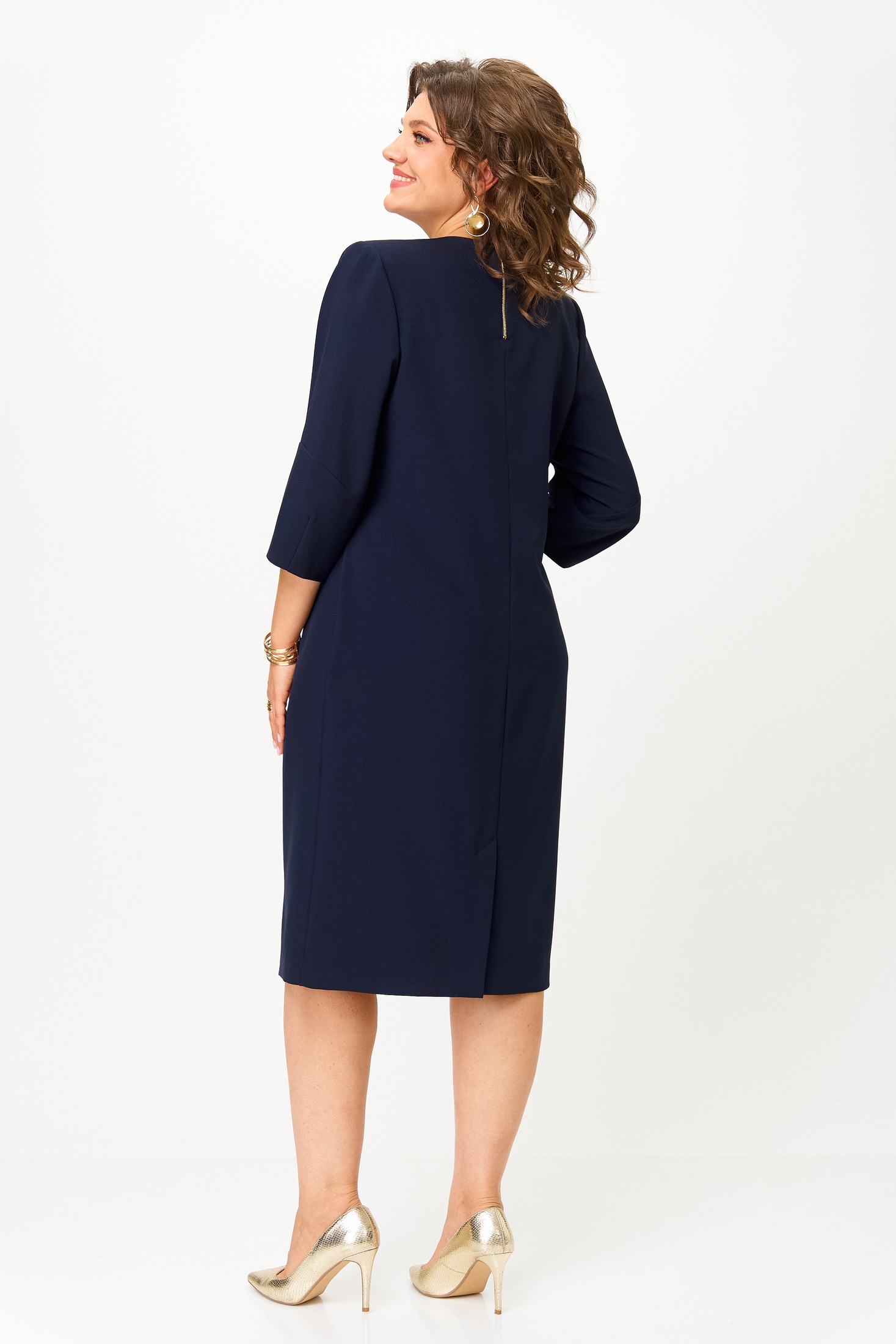 Платье женское, полуприлегающего силуэта. Спинка со средним швом, заканчивающимся шлицей. Перед с нагрудными вытачками от проймы и складками-защипами по талии. В данном платье в качестве декора прдложена молния в области талии и по среднему шву спинки. Рукав втачной, одношовный, длиной ¾. Рукав с подрезной деталью. Подрезная деталь по переду с вытачкой, для придания рукаву определенной формы и фасона в стиле-бохо. Горловина округлой формы с разрезом по центральной части, обработана обтачкой.