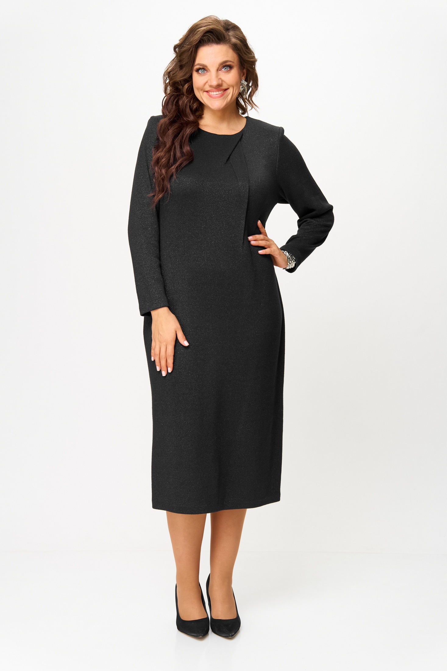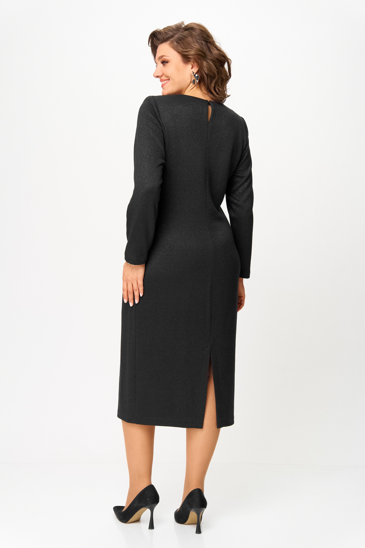 Элегантное миди-платье иссиня-черного цвета, изысканно переливающееся благодаря вплетению люрексовых нитей. Модель обладает полуприлегающим силуэтом, что подчеркивает фигуру, сохраняя при этом утонченный вид. Длинные втачные рукава и декоративный элемент у горловины добавляют изысканности. Застежка на пуговицу и петлю у горловины в сочетании с высоким разрезом на спине придают нотку соблазна. Платье идеально подходит как для повседневных мероприятий, так и для особых случаев.