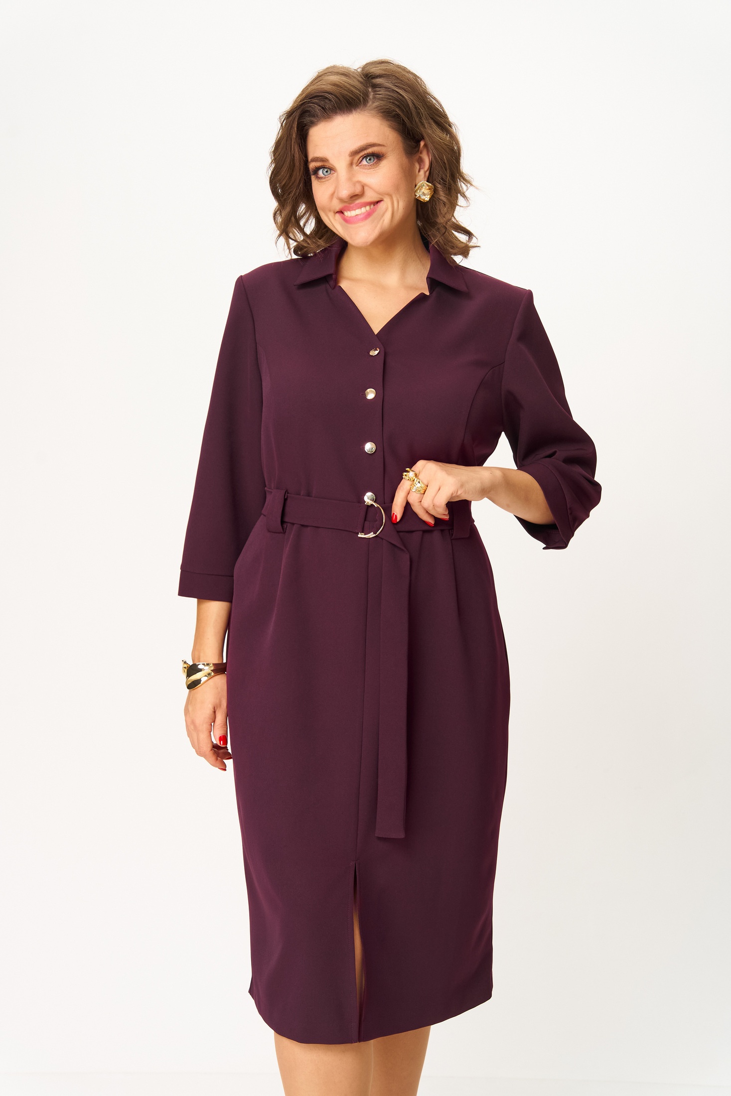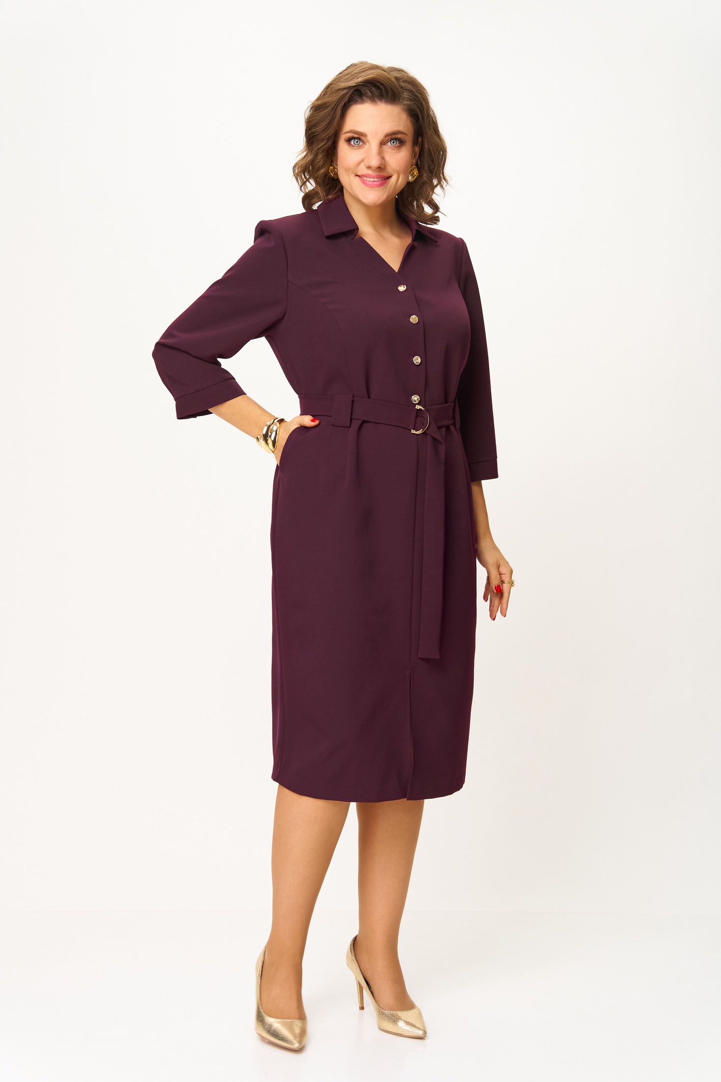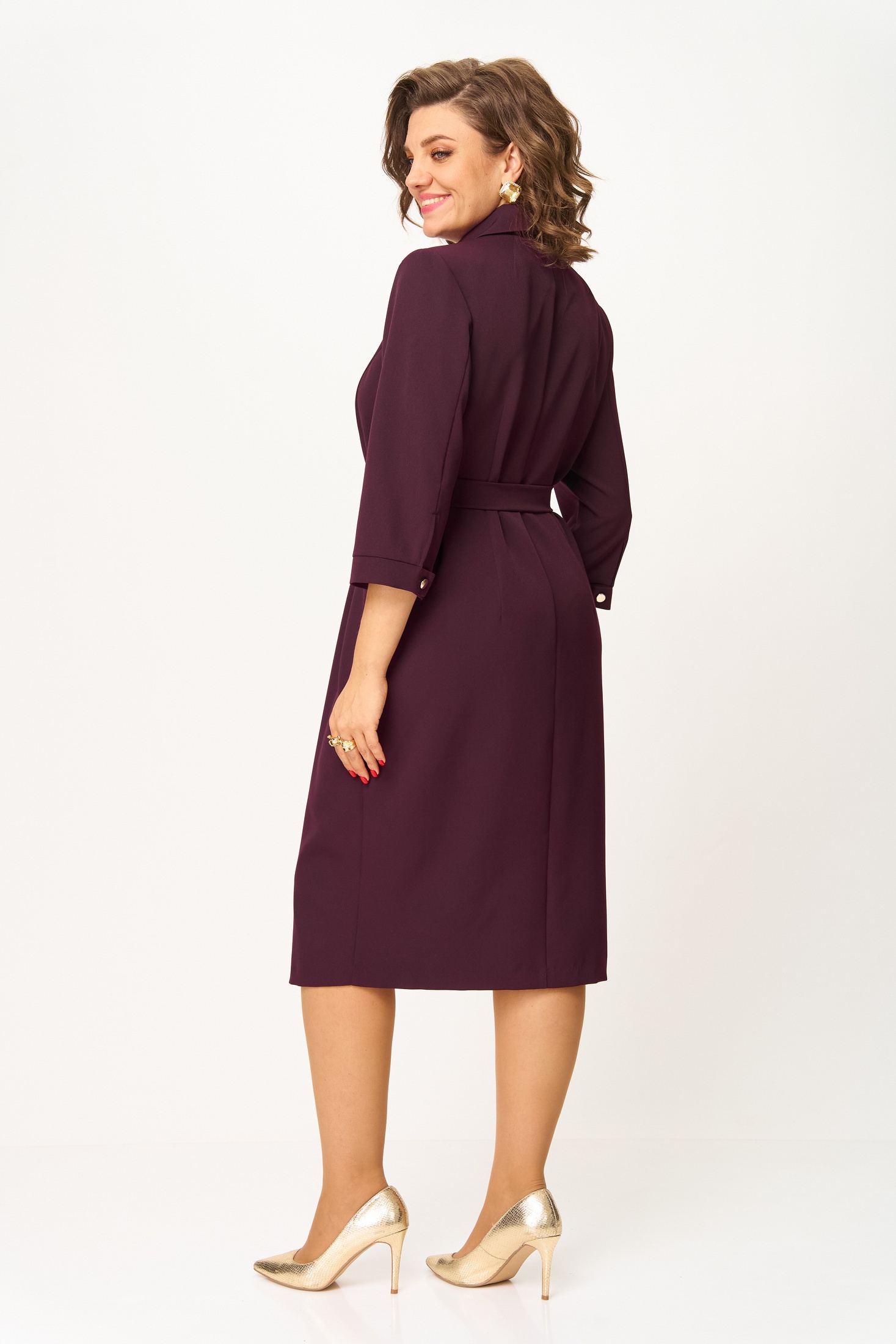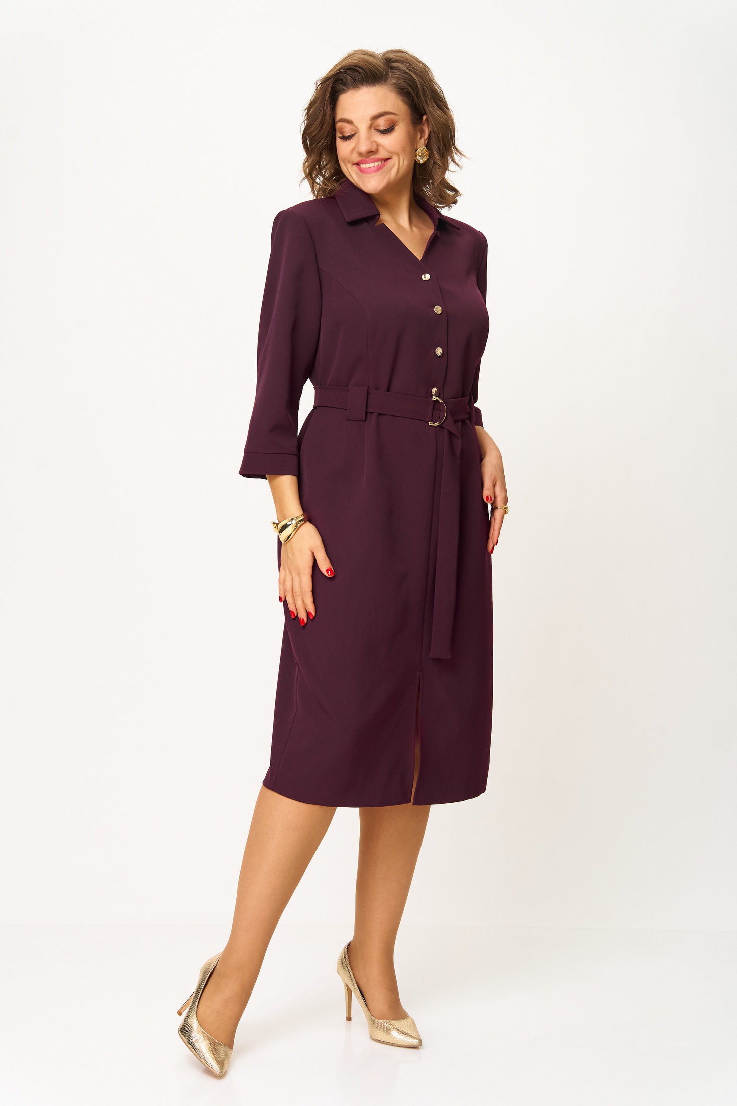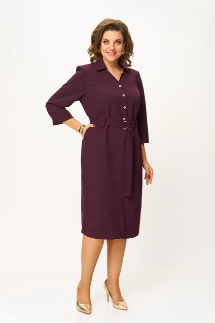 Платье полуприлегающего силуэта из плательной ткани, длины миди. Перед платья отрезной по линии талии, с центральной застежкой на петли и пуговицы. Имеется объемный пояс с пряжкой, который продет в декоративные шлевки по переду. Горловина платья фигурной формы с воротником рубашечного типа. Перед с рельефами выходящими из проймы до горизонтального подреза по талии. Нижняя часть переда платья с талиевыми вытачками и средним швом, в котором предусмотрен разрез. Есть фигурные карманы. Спинка платья со средним швом и талиевыми вытачками. Рукав втачной, двухшовный, на манжете с застежкой на петлю и пуговицу.