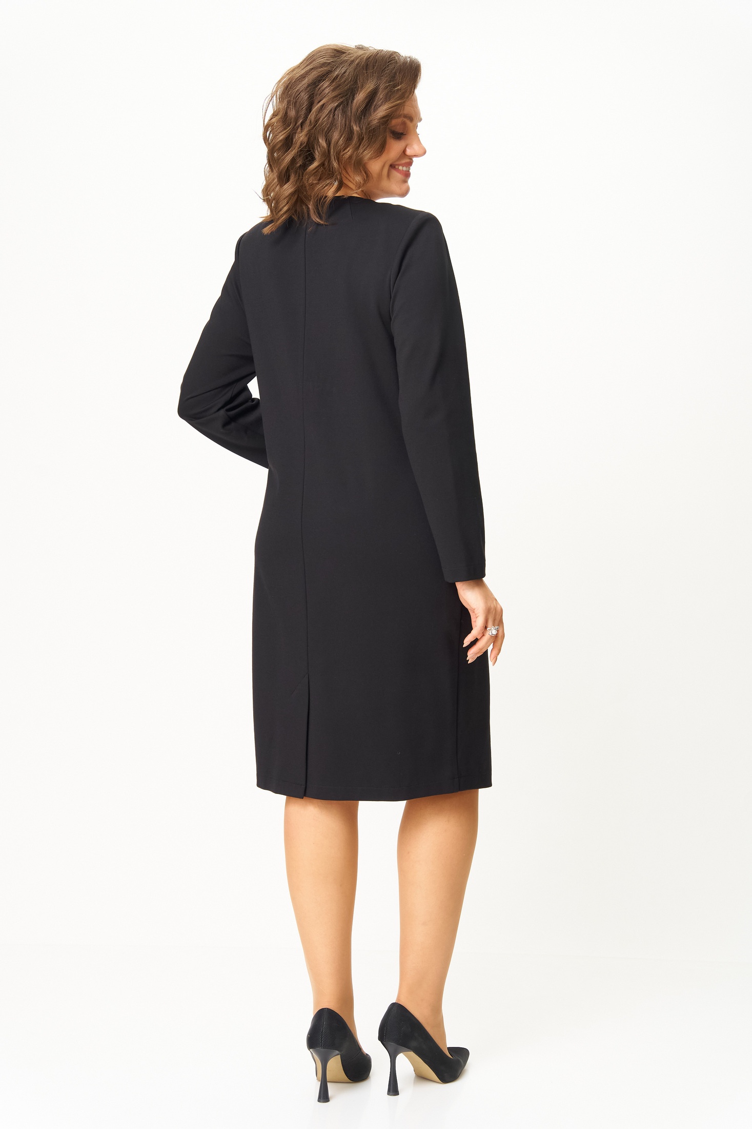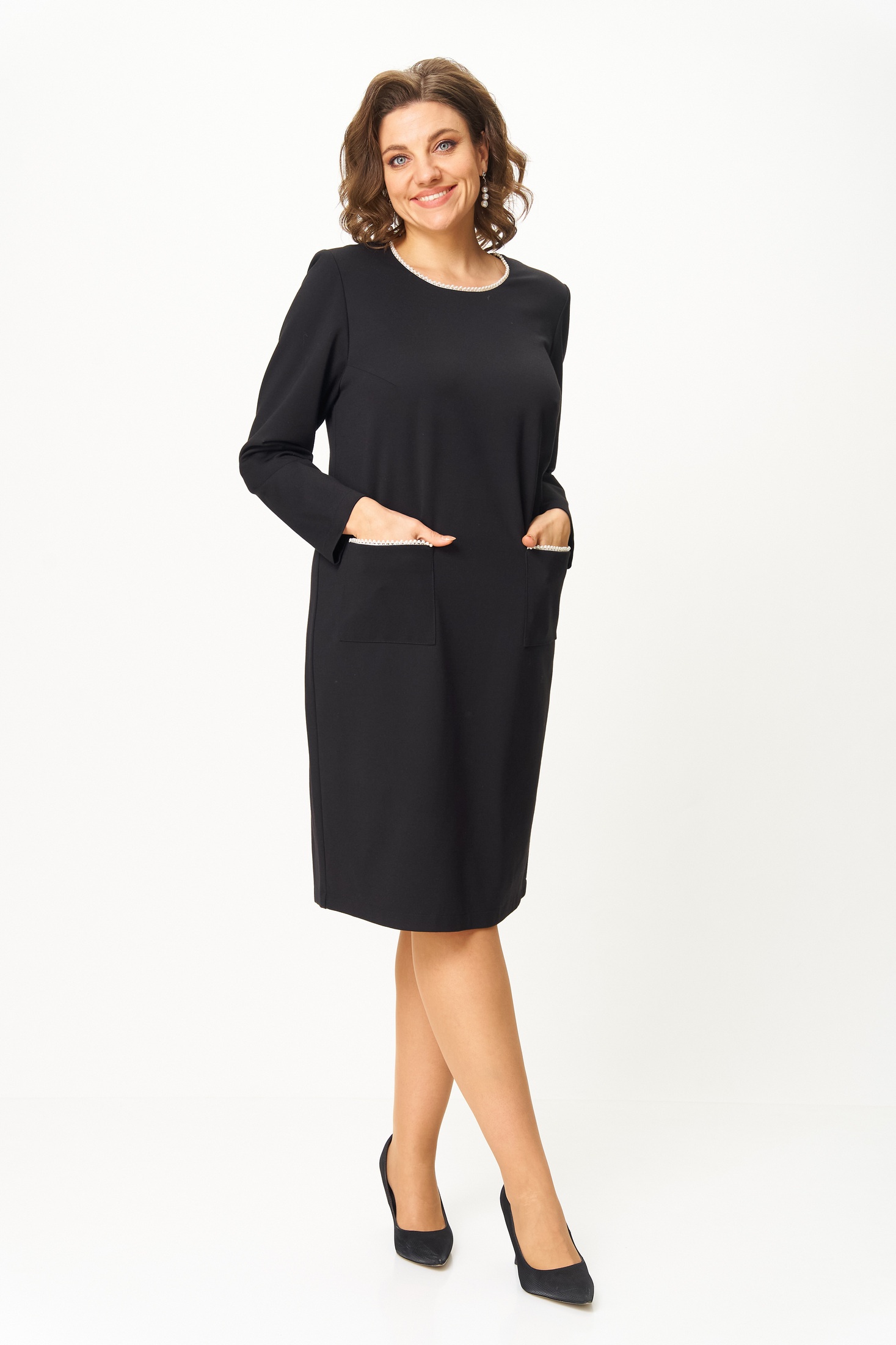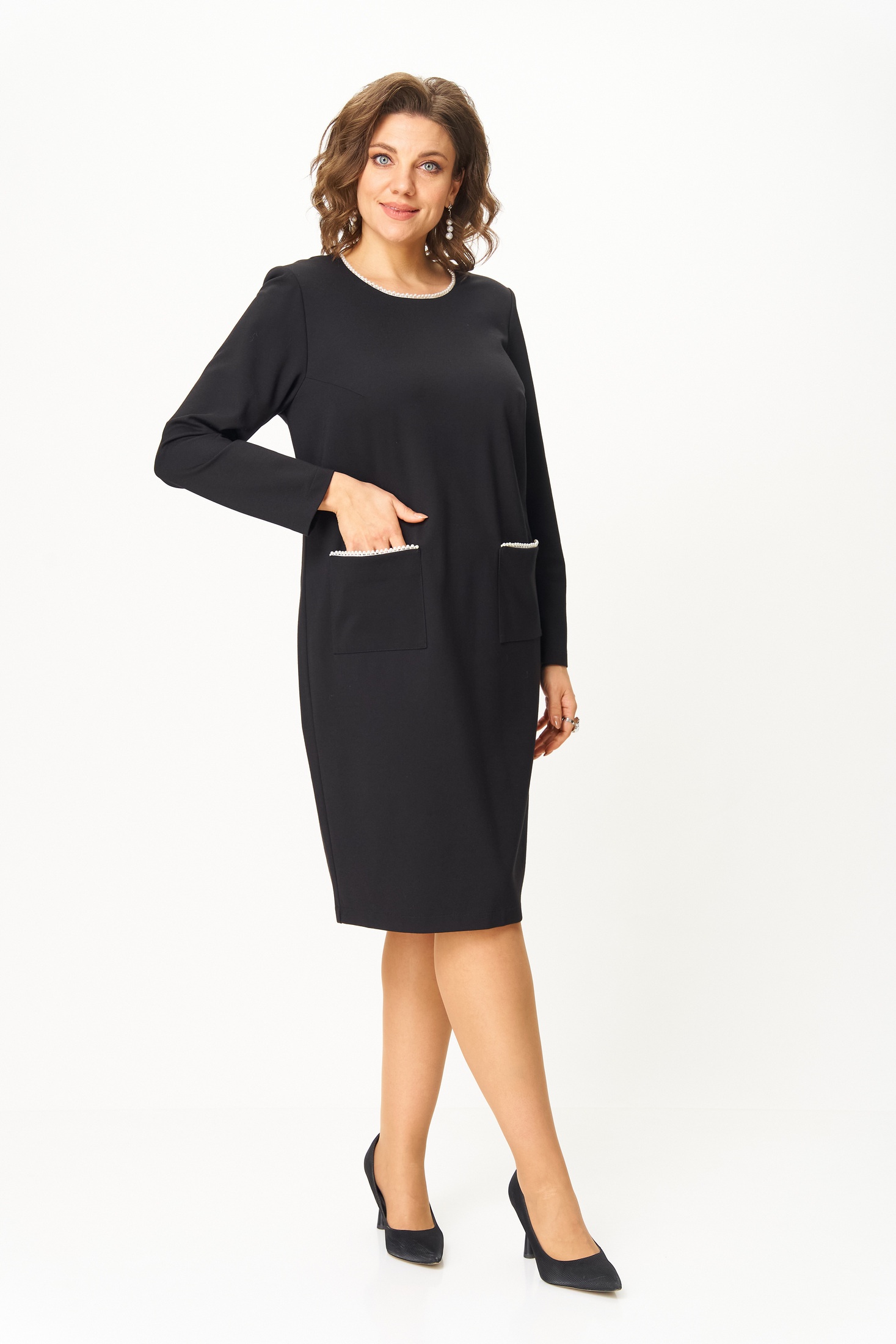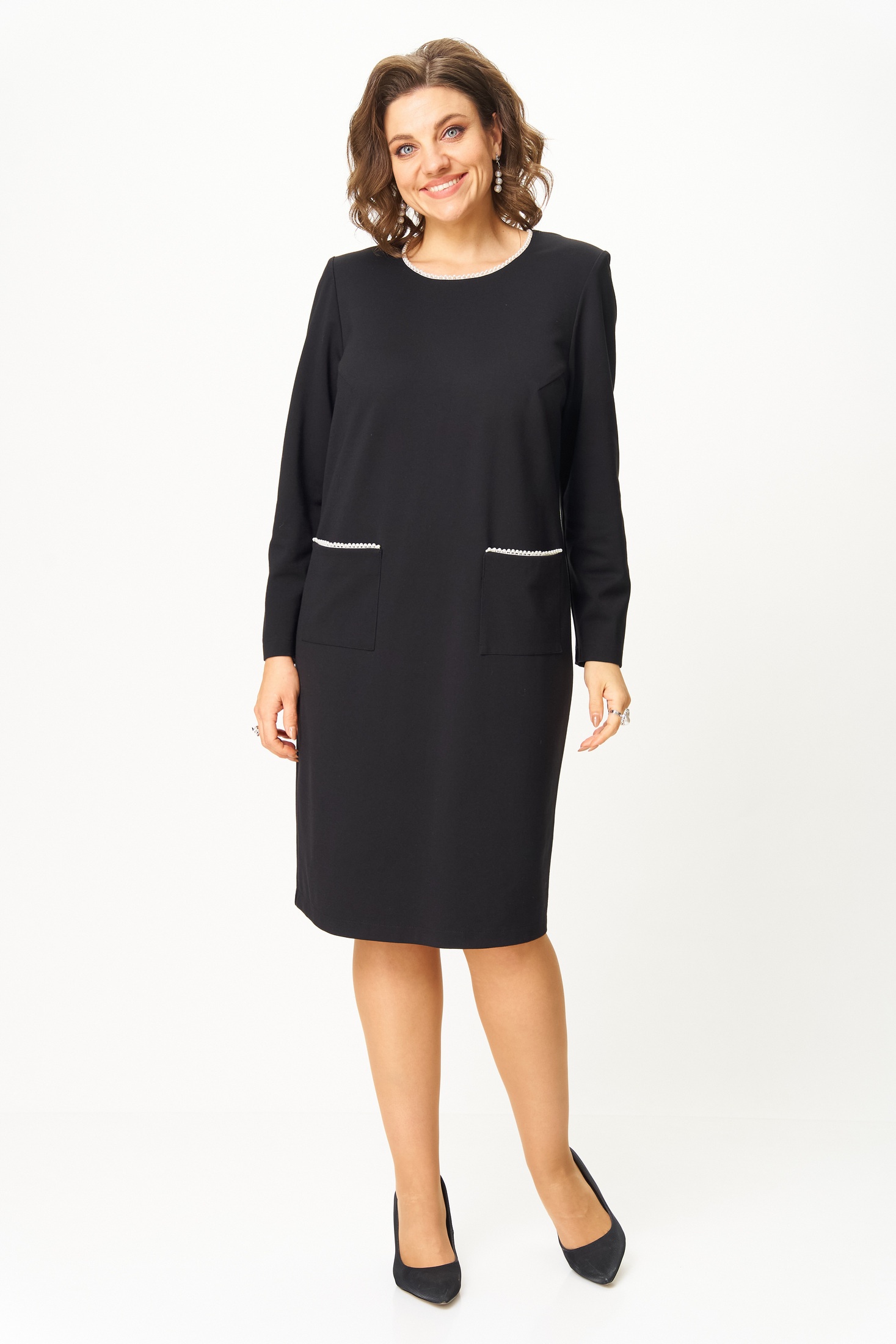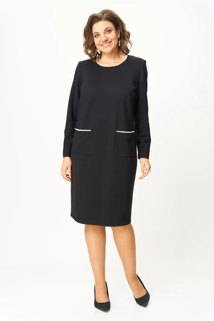Женственное платье полуприлегающего силуэта, изготовленное из мягкого трикотажа. Горловина переда выполнена в элегантной округлой форме, подчёркивая нежность образа. Нагрудные вытачки, плавно выходящие из проймы, обеспечивают идеальную посадку по фигуре. Передняя часть украшена накладными карманами, декорированными отделочной тесьмой, которая также оформляет горловину, добавляя изысканных деталей. Спинка платья приталена средним швом, в котором аккуратно встроена потайная тесьма-молния для удобства надевания. По низу спинки предусмотрена шлица, обеспечивающая свободу движений. Длинный одношовный втачной рукав завершает образ, подчеркивая утончённость и стиль изделия.