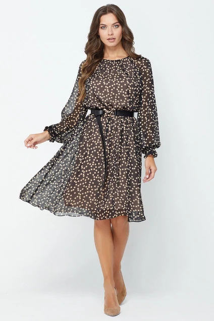 - Красивое платье А-образного силуэта с округлой формой горловины и прозрачными рукавами реглан, сшили из лёгкого фактурного шифона с романтичным дизайном в горох и 100% вискозной ткани. Максимально женственной модель делают струящийся силуэт, сборка по низу рукавов. Для удобства в носке по спинке обработана щелевидная застёжка на навесную петлю и пуговицу. Чтобы сделать платье ещё более эффектным, линию талии подчеркнули стильным поясом-ремнём с пряжкой.