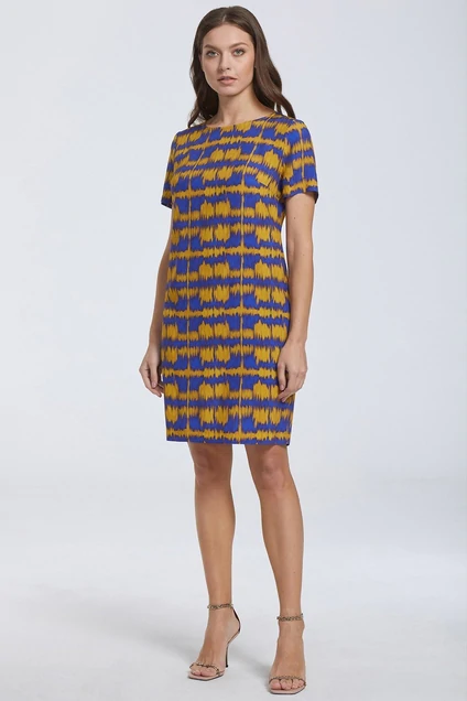 Лаконичное платье из мягкой, приятной к телу вискозной ткани со стильным ярким принтом в стиле «тай-дай». Модель прямого силуэта, с округлой формой горловины, с короткими втачными рукавами и функциональными карманами в боковых швах. Для удобства эксплуатации в среднем шве спинки обработана застёжка на навесную петлю и пуговицу. Это максимально комфортное платье в ситуации летней прогулки.