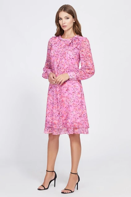 Воздушное платье с цветочным мотивом в розовых тонах выполнили из мягкого приятного шифона и 100 % вискозной подкладки. Модель А- образного силуэта украсили декоративными отсрочками по переду, рукавами- фонариками, заканчивающимися манжетами и воланом по низу. Округлый вырез горловины оформили воротником – стойкой с красиво оформленным бантом спереди. Для удобства в эксплуатации в среднем шве спинки обработана потайная молния и застежка на петлю-пуговицу.