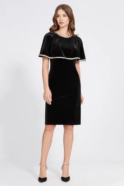 Откройте для себя наше шикарное и элегантное платье из бархата, украшенное большой стильной накидкой-оборкой и красивой тесьмой. Модель приталенного силуэта с округлой формой горловины, в среднем шве спинки обработана застёжка на потайную молнию. Воплотите свою утончённую элегантность с помощью этого уникального изделия, идеально подходящего для особых случаев.