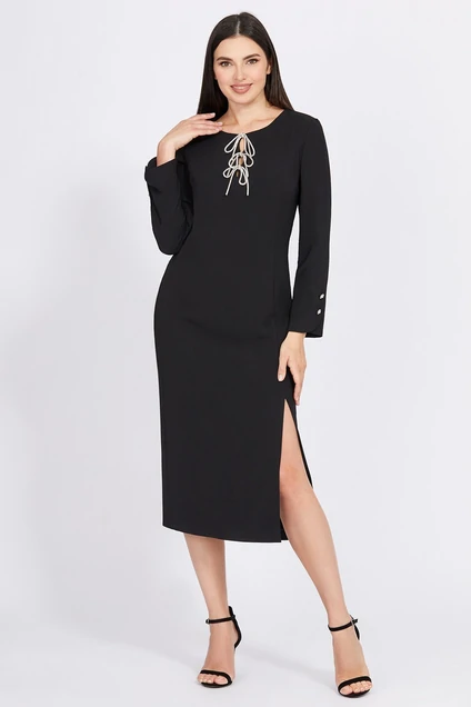 Это платье миди с его восхитительной элегантностью идеально подходит для официальных случаев. Блестящие банты из хрустальной тесьмы привлекают внимание, создавая изысканный контраст с матовой однотонной тканью, сдержанно скрывая глубокий фигурный вырез. Модель дополнена разрезом по переду, придающим лёгкость движению и подчёркивающим Вашу женственность, а также оригинальными рукавами с красивыми пуговицами-жемчужинами. В среднем шве спинки обработана застёжка на потайную молнию.