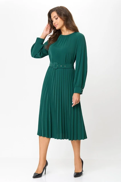 Это красивое платье, идеально подходящее для любого типа фигуры – безупречное предложение для тех женщин, которые любят оригинальную элегантность. Изделие сшили из мягкой,приятной, немнущейся ткани. Модель Х-образного силуэта длины миди, с округлой формой горловины со сборкой по переду и рукавами-реглан, сосборенными по низу манжетами и застёгивающимися на ювелирные пуговицы. В среднем шве спинки лифа обработана застёжка на навесную петлю и пуговицу. Платье привлекает к себе внимание также благодаря плиссированной юбке, придающей фигуре изящные движения. Линия талии акцентирована скрытой резинкой и красиво подчёркнута поясом с пряжкой в тон. В 50 размере длина до талии 38 см, полная длина 111,5 см.