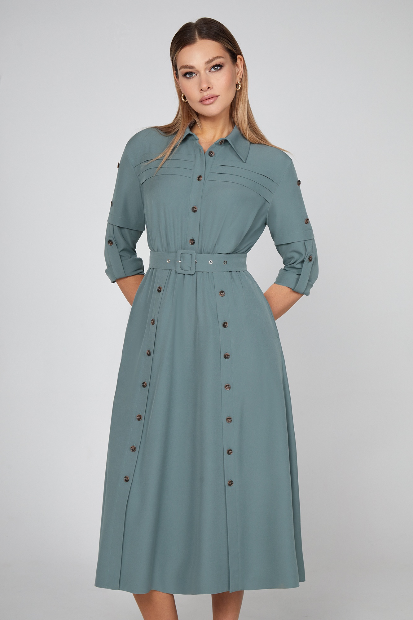 Стильное платье-рубашка с длинным рукавом и расклешенным кроем — идеальное сочетание легкости и элегантности. Модель со спущенной линией плеч выполнена из приятной вискозной испанской ткани и дополнена интересными элементами, придающими ей спортивный и динамичный характер. Отложной воротник и планка на пуговицах добавляют очарования, а рукава с манжетами можно закатать и зафиксировать при помощи паты и пуговицы, для создания непринужденного образа. Вертикальные складки , декоративные планки по юбке платья и отделочные пуговицы подчеркивают оригинальность этой модели, а карманы в боковых швах добавляют функциональности. Скрытая резинка на талии обеспечивает удобную посадку по фигуре, а пояс в тон с D-пряжками красиво подчеркивает талию.