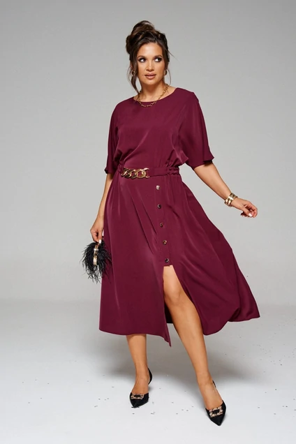 Платье женское, в нарядно-романтическом стиле; отрезное по линии талии; выполнено из лёгкого, струящегося, костюмно-смесового полотна. Конструкция верхней части платья выполнена в свободном стиле со спущенной линией плеча. Передняя, верхняя часть платья цельнокроеная. Спинка разрезная по среднему шву, в верхней части которого предусмотрен небольшой разрез с фиксацией на пуговицу. Нижняя, часть платья свободного кроя в форме трапеции. Передняя часть с отрезной планкой и декоративными пуговицами. Горловина округлой формы. Рукав цельнокроеный, объёмный, со спущенной линией плеча. Пояс на резинке, с декоративным элементом в виде цепи.