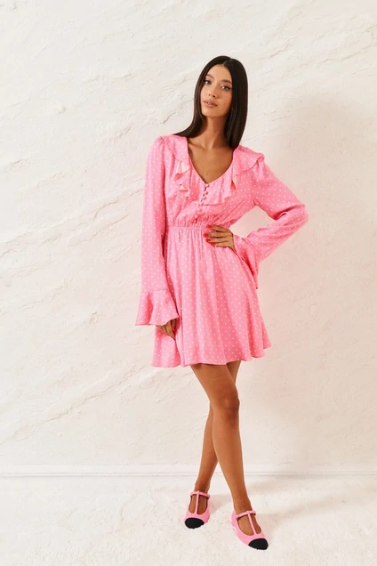 Платье полуприлегающего силуэта выполнено из розового полотна с принтом горох. Характеристики: полуприлегающий силуэт, отрезное, отрез на резинке, V образный вырез горловины, по периметру горловины нашит волна, по переду функциональные пуговички, пуговички декорированы тканью основного изделия, рукав втачной по низу рукава волан, низ в изделии на подкладке свободного кроя. Длина изделия 85 см, длина рукава 69 см.