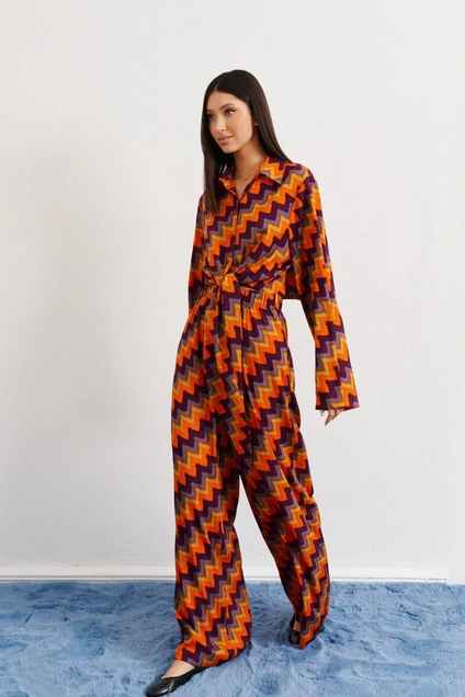 Яркий насыщенный комплект состоит из рубашки и брюк, выполнен из струящегося полотна с ярким принтом. Характеристики рубашка прямой свободный крой; воротник на стойке рубашечного типа, рукав втачной свободного кроя с разведением к низу, застежка центральная на петли пуговицы, по передней части изделия цельнокроеные завязки. Длина по спинке 41 см, длина рукава 64 см. Брюки прямого свободного кроя, пояс - резинка, в боковых швах карманы. Длина брюк 108 см.