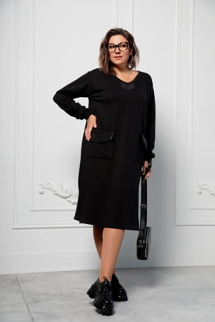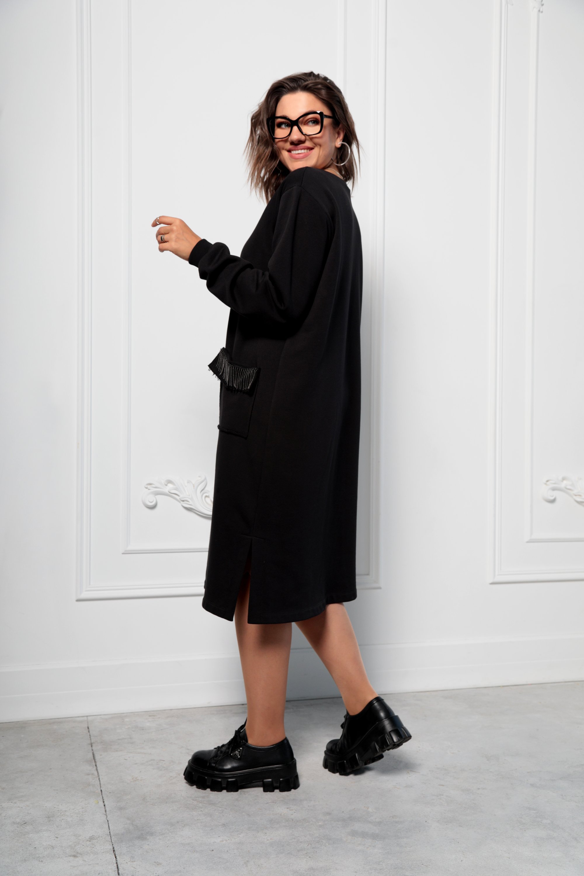 Платье женское, полуприлегающего силуэта. Выполнено из трикотажной ткани с содержанием хлопка 65%. Стиль спорт-шик сейчас занимает лидирующие позиции в гардеробе современной леди. Благодаря своей универсальности платье можно носить как под каблук, так и под лоферы в спортивном стиле. Рукав свободного кроя, со слегка спущенной проймой и манжетой из кашкорсе. Горловина имеет V - образный вырез. В боковых швах разрезы, что добавляют удобство при движении. Передняя часть и карманы на лицевой стороне, так же декорированы тесьмой из металла. Замеры в готовом изделии: