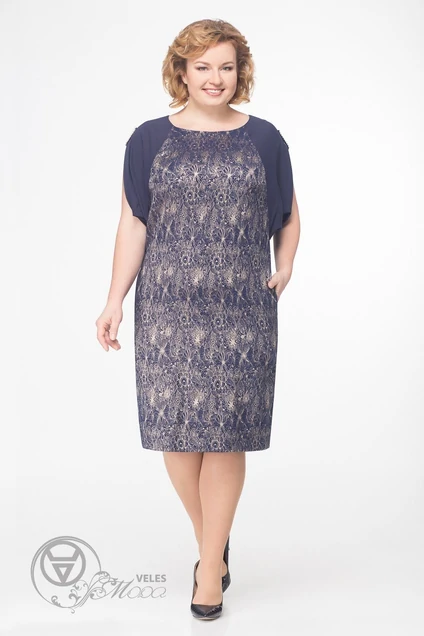 Платье женское полуприлегающего силуэта, с круглым вырезом горловины. Спинка со средним швом, заканчивающимся разрезом. Рукава типа реглан фантазийной формы из отделочной ткани, длиной ¾ окантованы бейкой, с декоративной патой в верхней части. Отделкой платья служит украшение для одежды, пришитое к патам рукавов. Длина платья 96-100 см Длина плеча 16 см