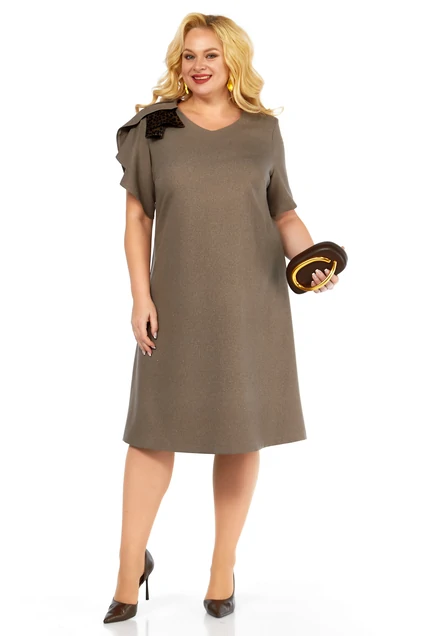 Очаровательное платье женское, А-образного силуэта, выполнено в спокойном бежевом оттенке. Модель с втачным рукавом до линии локтя и вторым, более сложного кроя, украшенным элегантным бантом на правом плече. Платье дополнено застежкой-молнией на спинке, что обеспечивает удобное надевание. Простой, но изысканный дизайн делает этот наряд универсальным выбором для различных случаев.