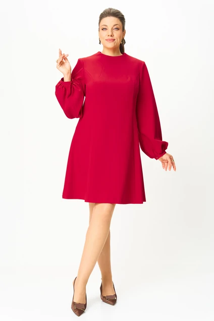 Платье «А» образного силуэта с рельефными швами по переду и спинке. Горловина круглая с цельновыкроенной стойкой. Застежка на тесьму молния в центральном шве спинки. Рукава втачные, со сборкой по низу, на узком манжете с застежкой на петлю и пуговицу.