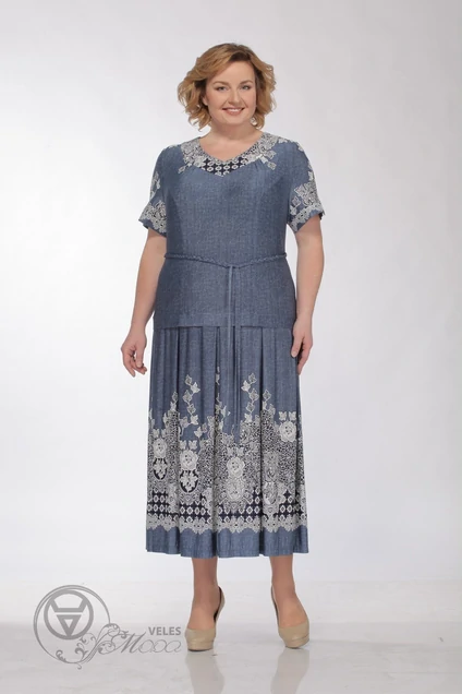 Элегантное женское платье ,полуприлегающего силуэта, отрезное по линии бедер, юбка заложена складками. Горловина «V» образная с отрезной планкой.Рукава  втачные ,короткие, низ рукава оформлен манжетом. Ы комплект прилагается пояс ,заплетенный в косу. Платье выполнено из эластичного ,трикотажного полотна.
