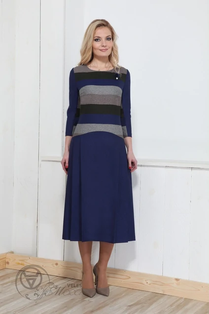 Длина платья по спинке 120 см Длина рукава 48 см Стильное молодежное платье, полуприлегающего силуэта, лиф из полосатой ткани на подкладке ,горловина круглая по спине застежка на молнию.Юбка из однотона со складками. Рукава втачные двухшовные.