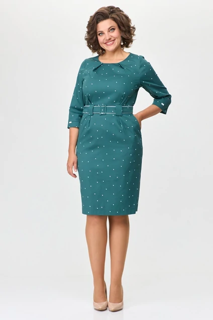 Горловина круглая. Спинка с центральным швом и застежкой на тесьму молния. Рукава втачные, короткие с притачной манжетой и ярким декоративным элементом. Платье со съемным поясом. Пояс с отделкой из яркого канта и пряжкой. Длина платья по спинке – 101 см Длина рукава – 49-50 см