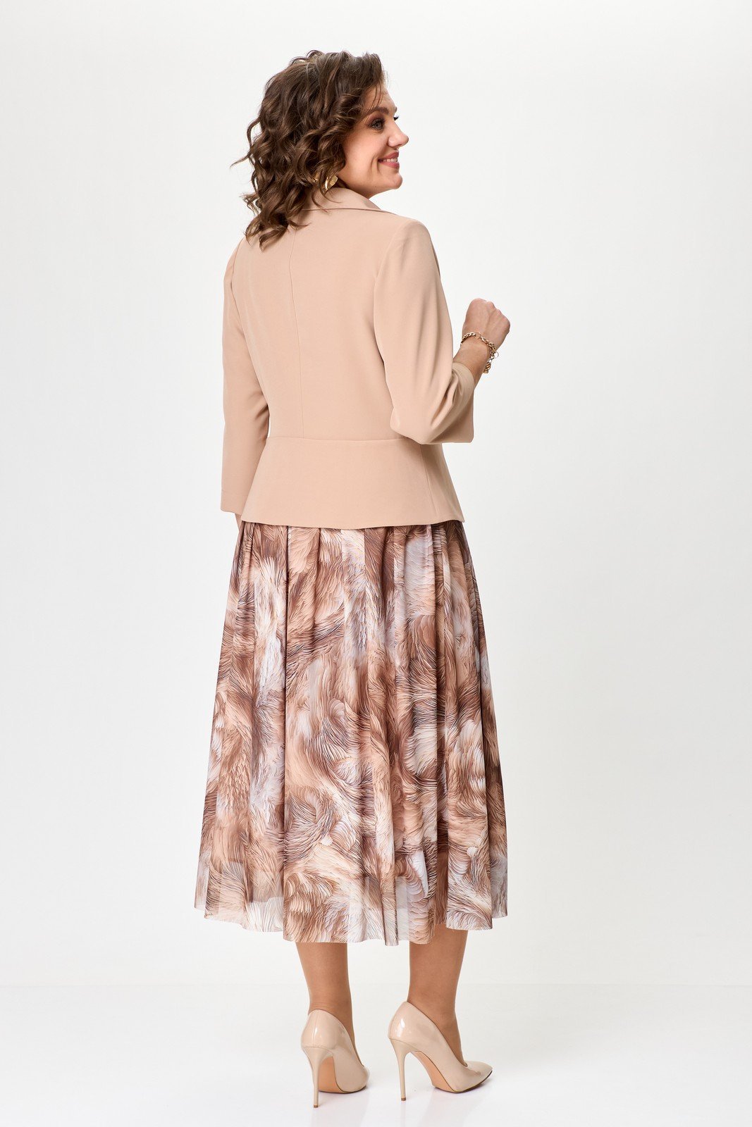 Элегантное женское платье, выполнено из двух видов ткани. Верх из плательной ткани, низ – сетка. Платье полуприлегающего силуэта, верх жакетного типа с запахом. Юбка расширенная со сборкой по талии, на подкладке. Платье украшено съемным цветком ручной работы. Длина платья – 124 см Длина рукава – 47,5 см