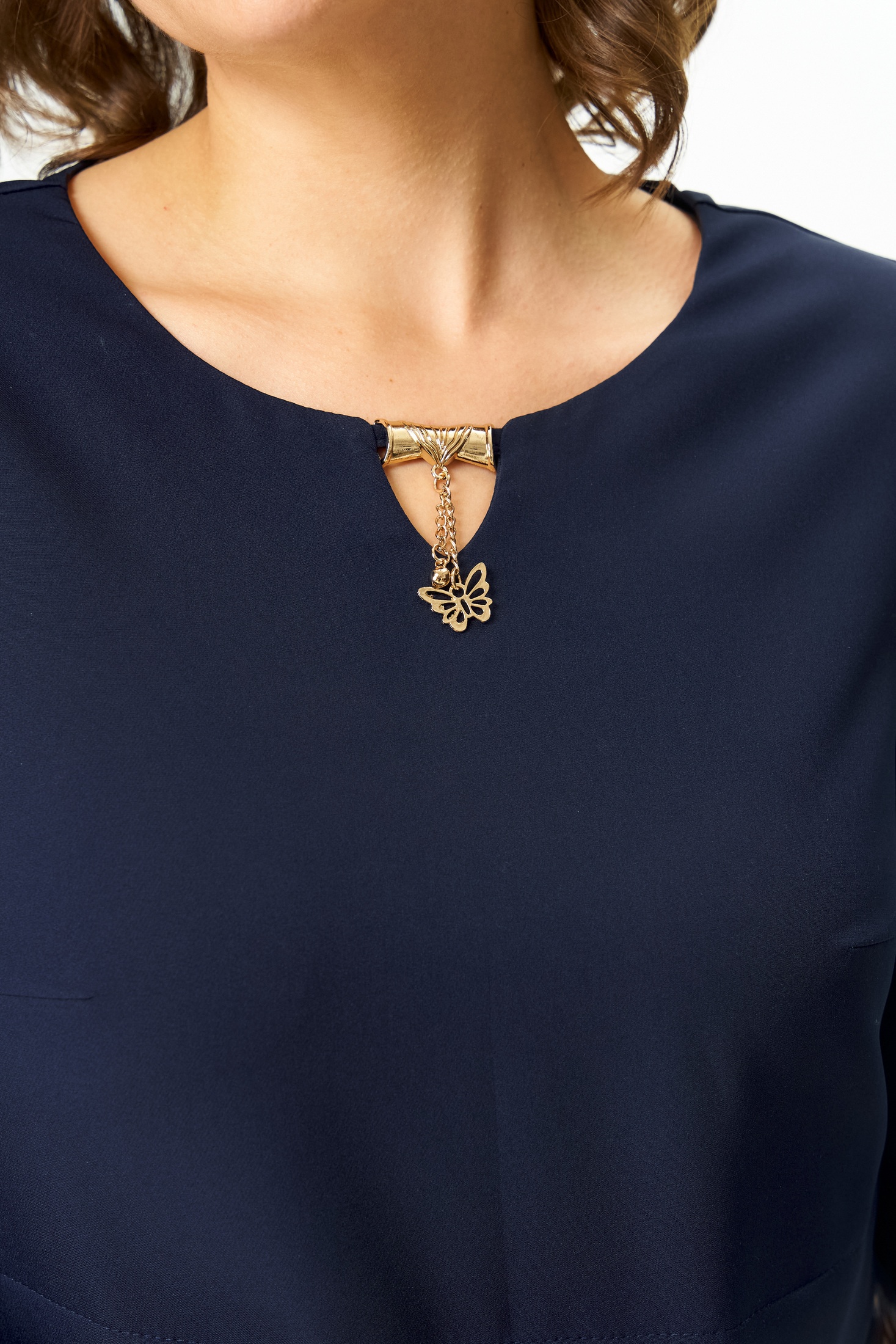 Лиф из плательной ткани, горловина круглая с декоративным элементом по центру, по низу лифа ответная складка, по переду низ асимметричный, рукава втачные, по низу декоративный элемент с пуговицей.