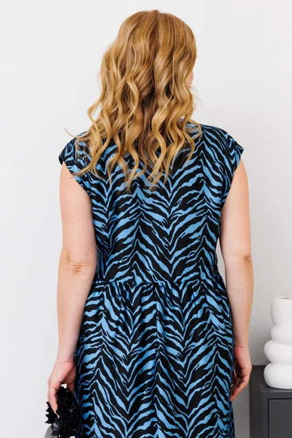 Элегантное платье миди с захватывающим контрастным принтом в виде зигзагообразных волн синего и белого цветов. Изделие оснащено застежкой на пуговицы спереди, что добавляет удобства при надевании. Платье отрезное по талии со сборкой, что подчеркивает силуэт, а нагрудная вытачка обеспечивает идеальную посадку. В комплекте предусмотрена подкладка для юбки, что гарантирует комфорт при носке. Общая длина изделия составляет 124 см, делая его идеальным выбором для различных мероприятий. Выразительный дизайн и продуманные детали делают это платье не только стильным, но и практичным выбором для вашего гардероба.