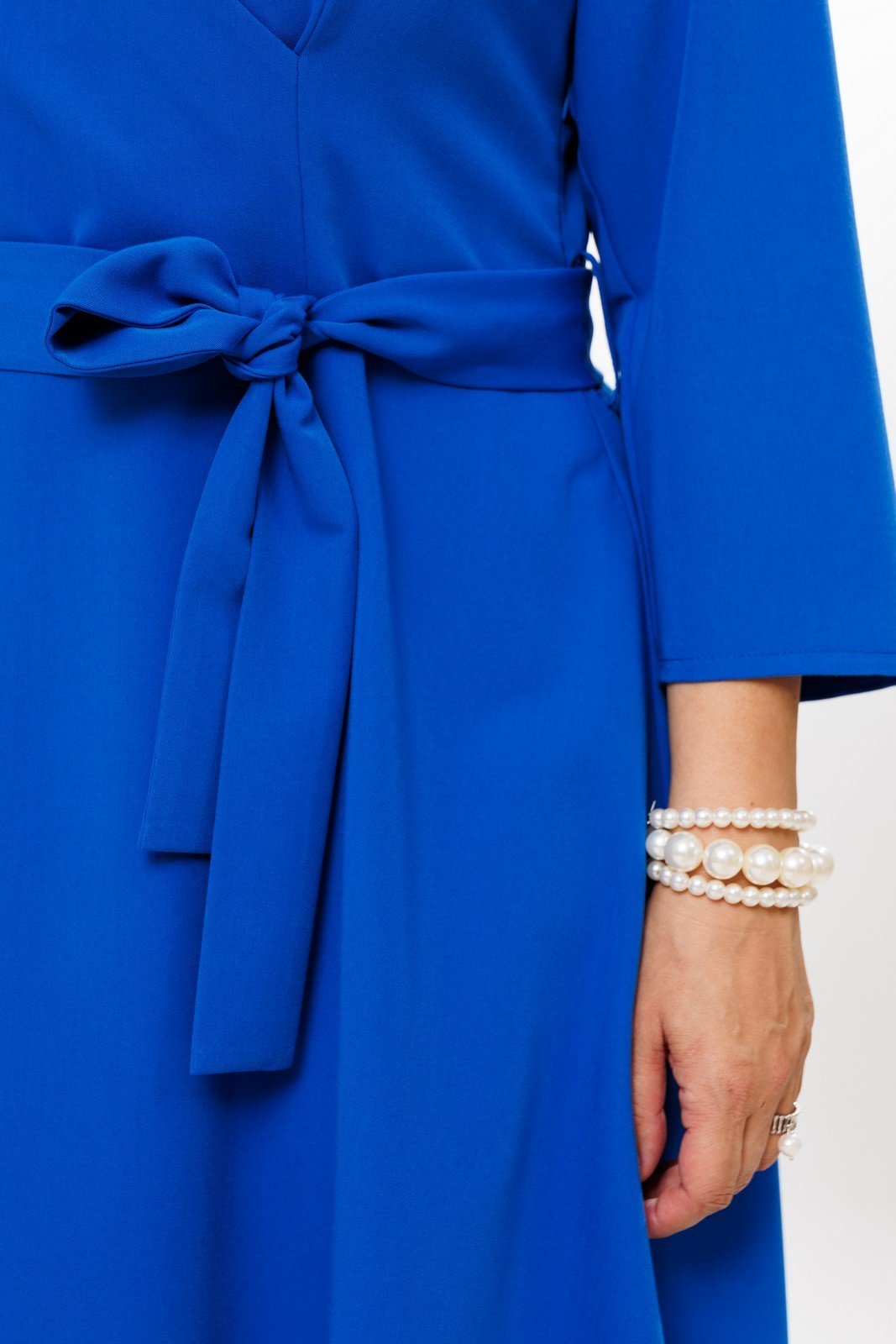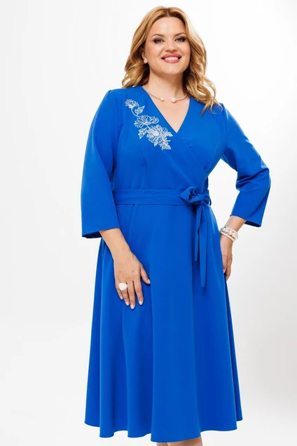 Элегантное нарядное платье глубокого синего цвета. Модель отрезная по линии талии, с нижней частью, расширенной к низу. Дизайн линии талии подчеркивается съемным поясом из основной ткани. Лиф платья стилизован под модель на запах, что добавляет изысканности. Рельефные швы на груди аккуратно моделируют фигуру. Особое внимание привлекает авторская вышивка в виде "хрустальных линейных цветов", изящно украшающая верхнюю часть платья. Рукава длиной ниже локтя дополняют образ, придавая ему законченность. Платье оснащено потайной молнией в боковом шве для удобства надевания. Общая длина платья составляет 111 см, длина рукавов — 48 см. Идеальный выбор для торжественных событий, где требуется сочетание комфорта и элегантности.