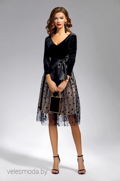 Платье полуприлегающего силуэта с втачным рукавом 3/4. V-образным вырезом по полочке и спинке. Отрезное по талии. Нижняя часть платья двухслойная из атласа и органзы в горох. Платье с широким съёмным бантом.
