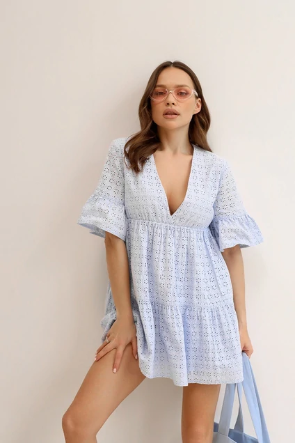 Платье летнее из хлопкового шитья. Платье свободного силуэта, с втачным рукавом. Платье на подкладке. Перед с V-образным вырезом, подрезом под грудью и сборкой и вторым воланом, присборенным по шву притачивания. По рукаву притачан волан со сборкой.