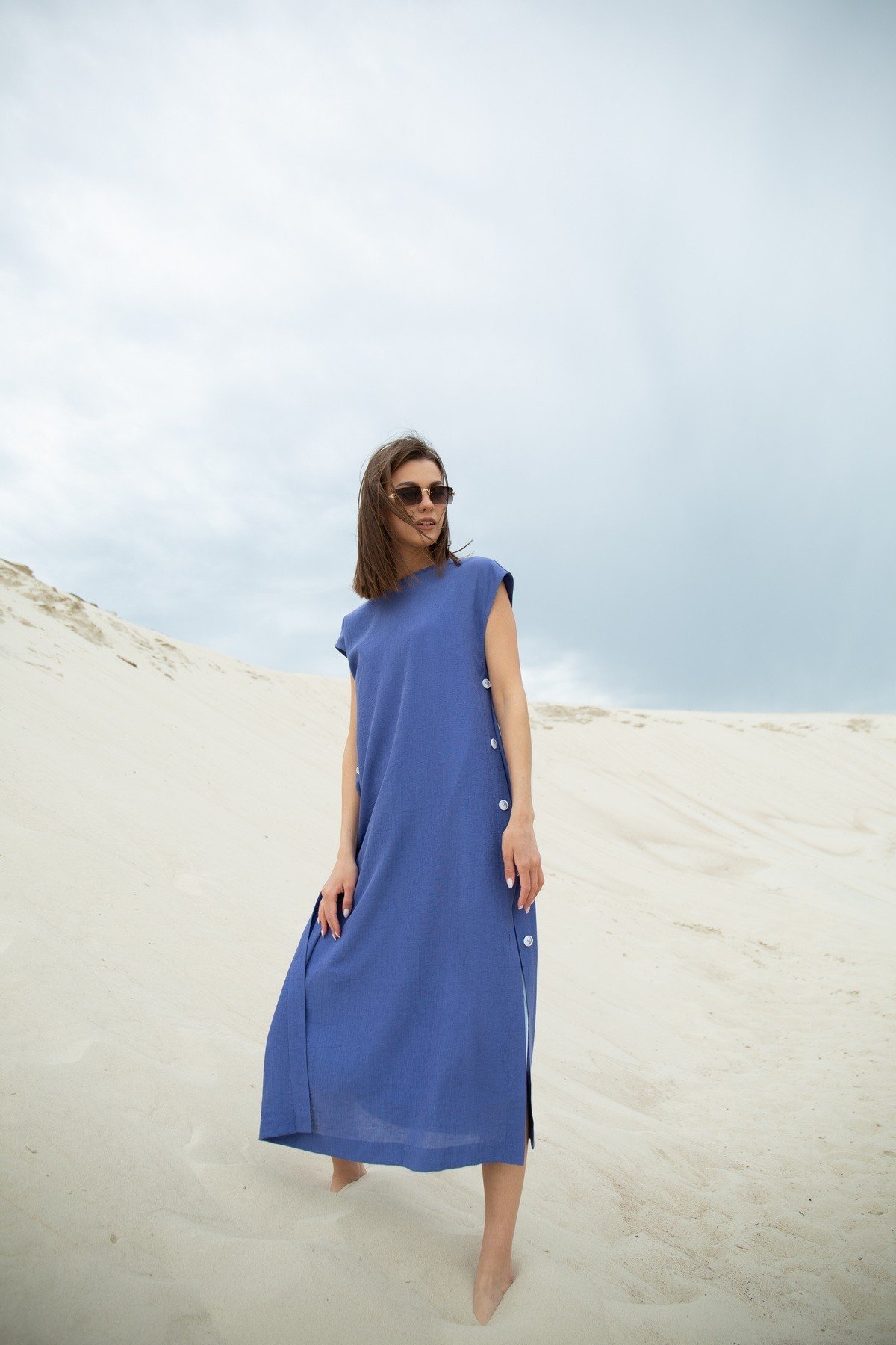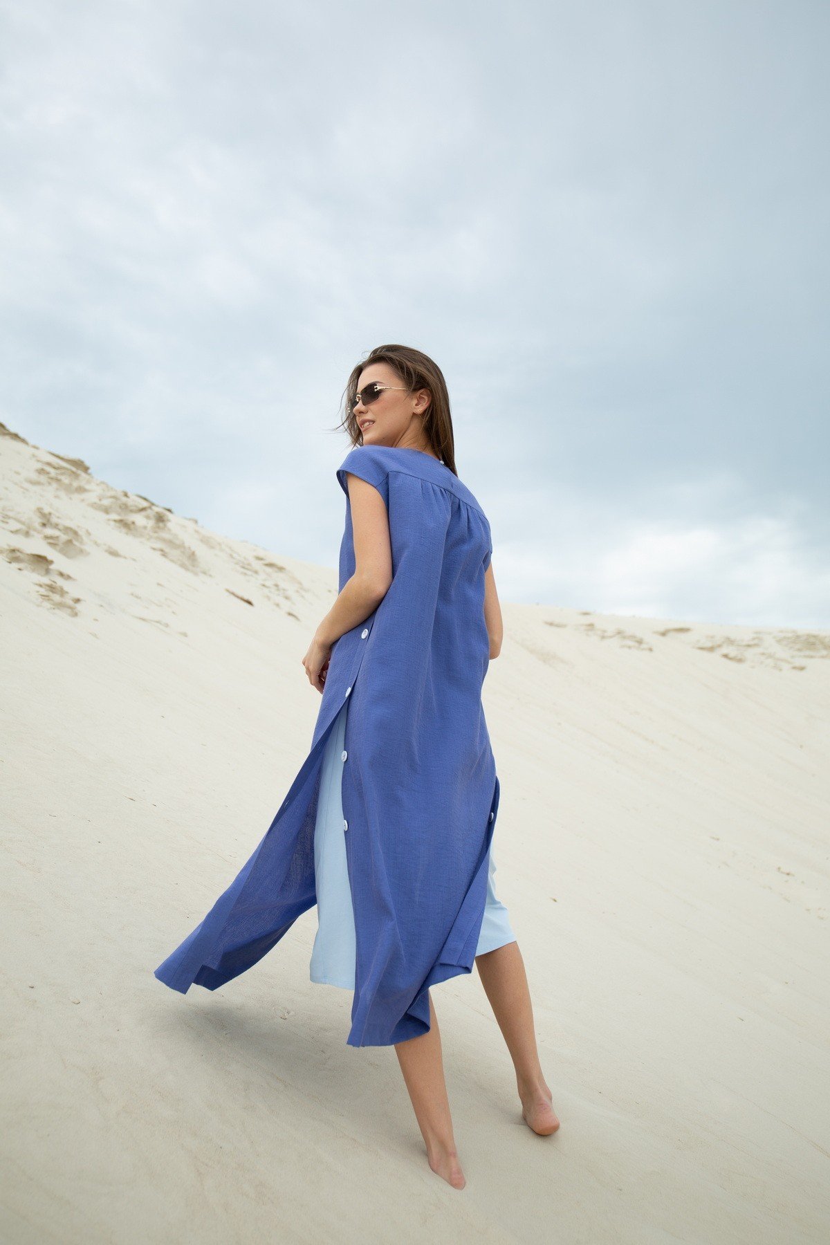 Платье, состоящее из 2-х частей: нижнее платье на регулируемых бретелях, выполненного из хлопкового трикотажного полотна, верхнее платье со спущенным плечом, планками с застежкой по боковым швам. По спинке с кокеткой, сборкой и застежкой на навесную петлю с пуговицей.