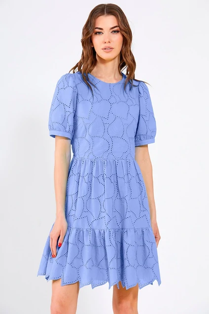 Платье летнее из хлопкового шитья. Полуприлегающего силуэта, с втачным рукавом, отрезное по талии. Полочка отрезная по талии, с нагрудной вытачкой. Нижняя часть платья присобрана по линии талии. По низу отрезной волан. Спинка с фигурным вырезом, застежкой по горловине спинки на пуговицы, и от боковых швов с пояском на завязках. По талии отрезное, нижняя часть вверху на резинке, по низу отрезной волан со сборкой. Рукав внизу на узкой манжете, присобран по окату и по шву притачивания манжеты.