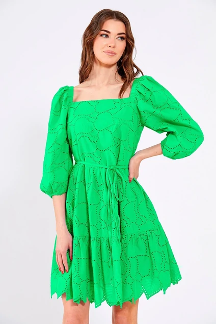 Платье женское, летнее из хлопкового шитья. Свободного А-силуэта силуэта с рукавом-реглан на широких бретелях с резинкой, сборка по шву притачивания к детали с резинкой. Вырез горловины по полочке и спинке каре. По низу два яруса воланов, присобранных по швам притачивания. Платье на подкладке. Низ рукава присобран на резинку. В боковых швах платья пояс-завязки, позволяющие регулировать обьем по талии.