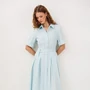 Платье А-образного силуэта, длинное, со спущенной линией плеча, рукав в низу на широкой подгибке (отворот), благодаря чему длина рукава может варьироваться. Полочка с V-образны вырезом и карманами в боковых швах. Внизу по боковым швам разрезы. Платье без подкладки. В комплекте также есть узкий пояс из основной ткани благодаря чему можно поменять силуэт платья. Модель в 2 размерах M(44-48), L(50-54).