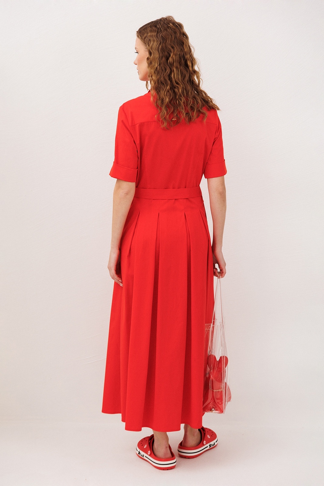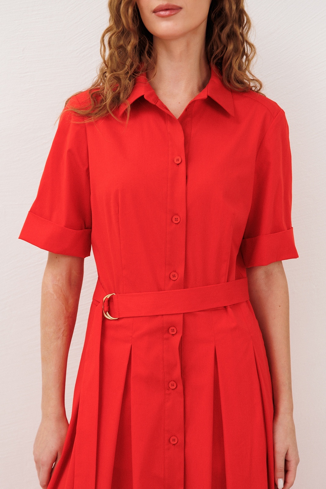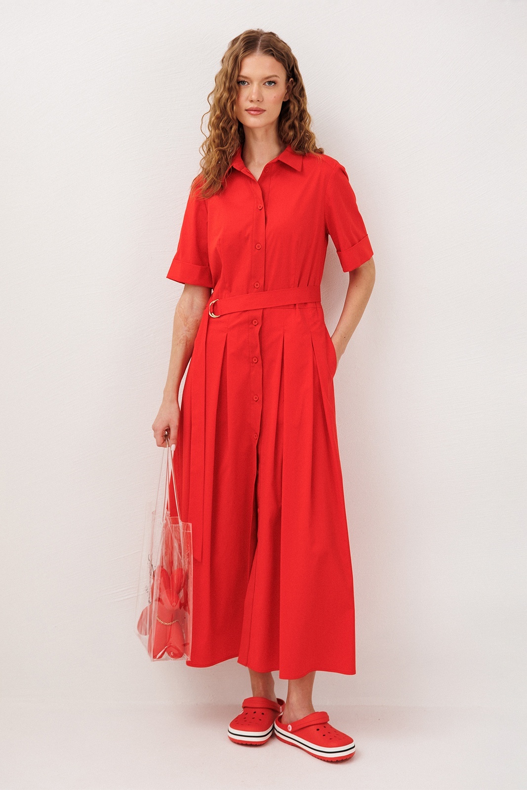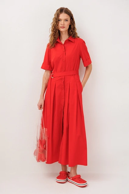 Платье 3341 красный BUTER сочетает в себе утончённость и комфорт. Коллекция бренда BUTER предлагает это изысканное длинное платье, изготовленное из хлопка с добавлением полиэстера и эластана, обеспечивающее лёгкость и дышащие свойства ткани. Приталенный фасон с талиевой вытачкой и юбкой со встречными складками подчёркивает женственность и изящество. Короткие рукава до локтя и рубашечный воротник придают платья классическому стилю. Платье снабжено центральной застежкой на пуговицы и карманами в боковых швах, что делает его удобным для повседневной носки. Яркий красный цвет и отрезная линия талии с поясом на полукольцах добавляют нотку элегантности. Идеально подходит для тёплого сезона и носки на каждый день.