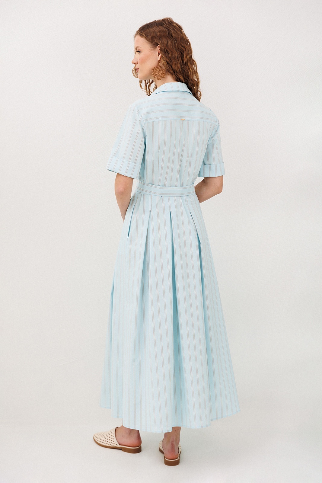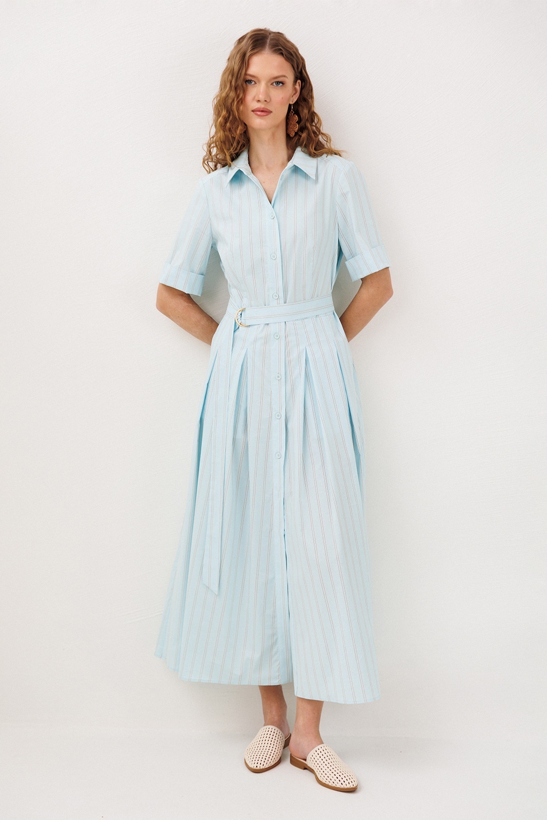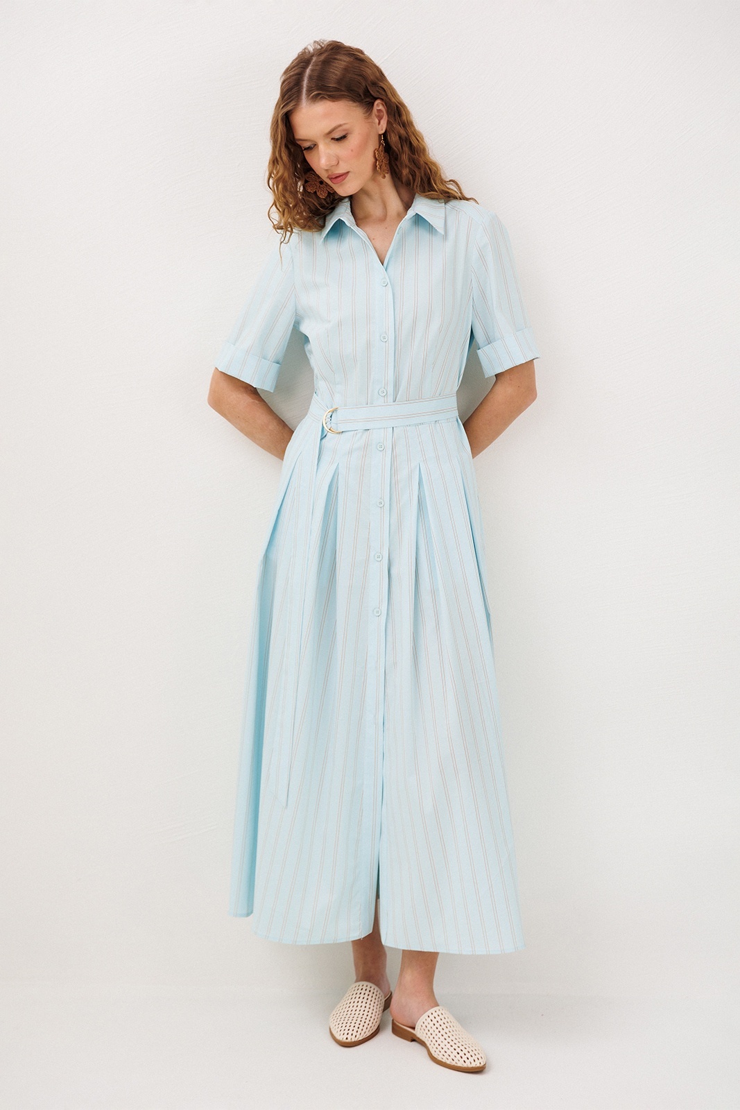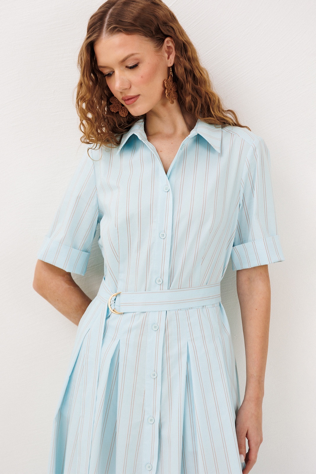 Платье 3341 небесная полоска BUTER — это изящная модель из коллекции бренда BUTER, выполненная из долговечного материала, содержащего 72% хлопка. Легкий и дышащий, этот материал идеально подходит для летнего сезона. Платье миди длины имеет короткие рукава и отложной рубашечный воротник на стойке, придающий изделию классический стиль. Центральная застежка на пуговицы и съемный пояс с полукольцами обеспечивает удобную посадку и подчеркивает линию талии. Карманы в боковых швах добавляют практичности, а юбка со встречными складками от талии создает женственный и утонченный силуэт. Идеально для повседневных выходов и работы, подчеркивая ваш уникальный стиль в любых условиях.