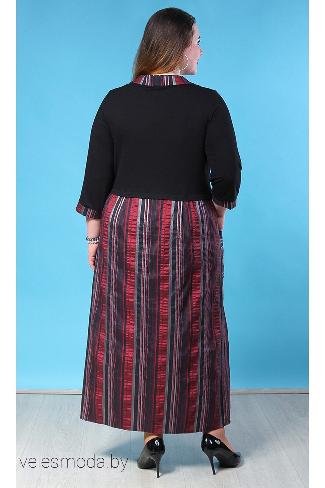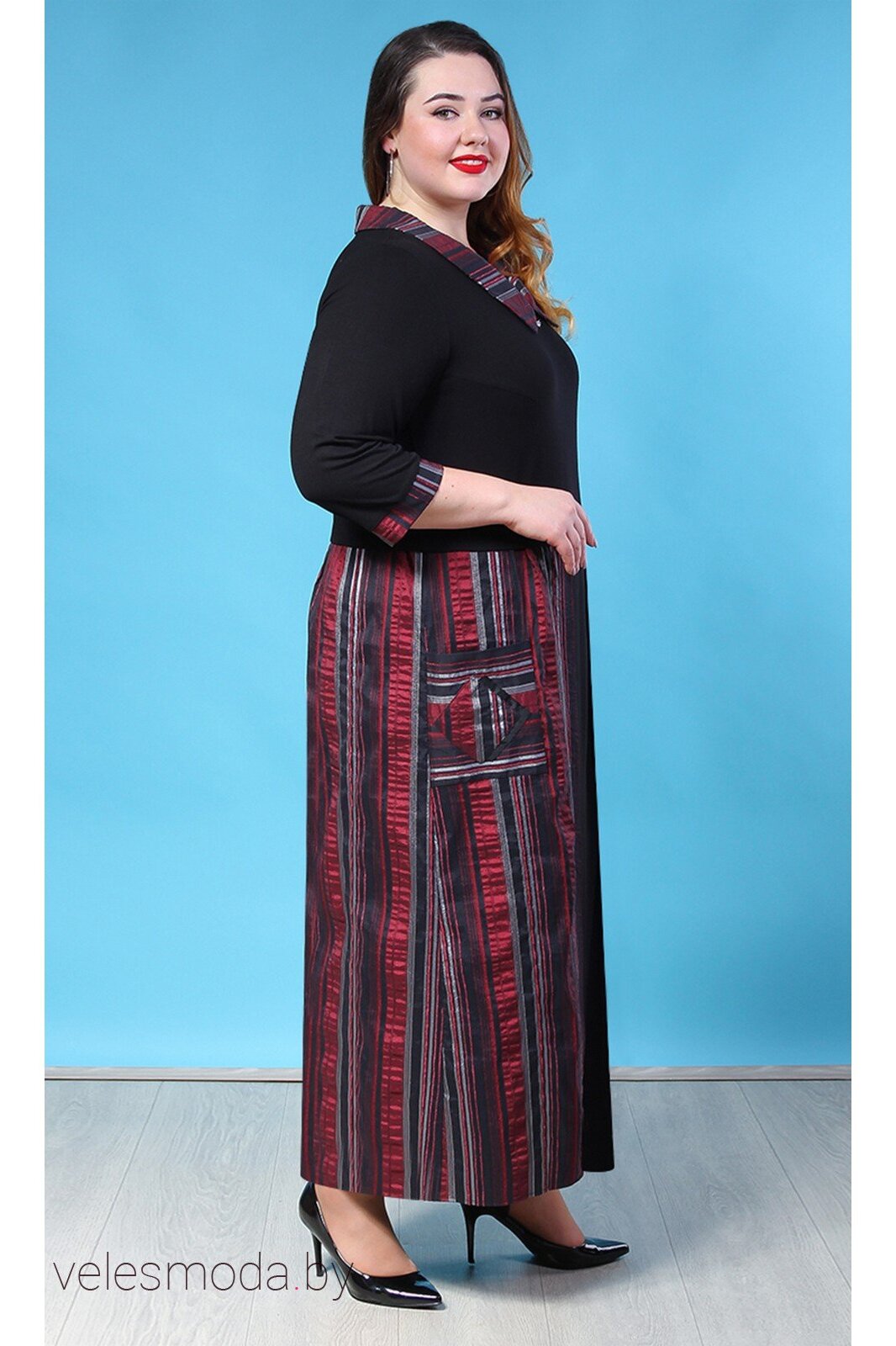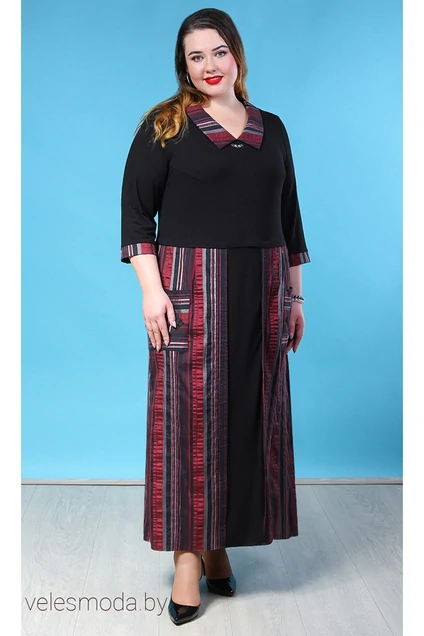 Это платье мы разработали специально для дам "пышных форм".  Безупречный наряд в пол с отложным  воротником на стойке, карманами спереди и разрезами сбоку. Расцветка в полоску отлично подчеркнет  достоинства Вашей фигуры. В этом платье Вы будете чувствовать себя уверенно и комфортно.