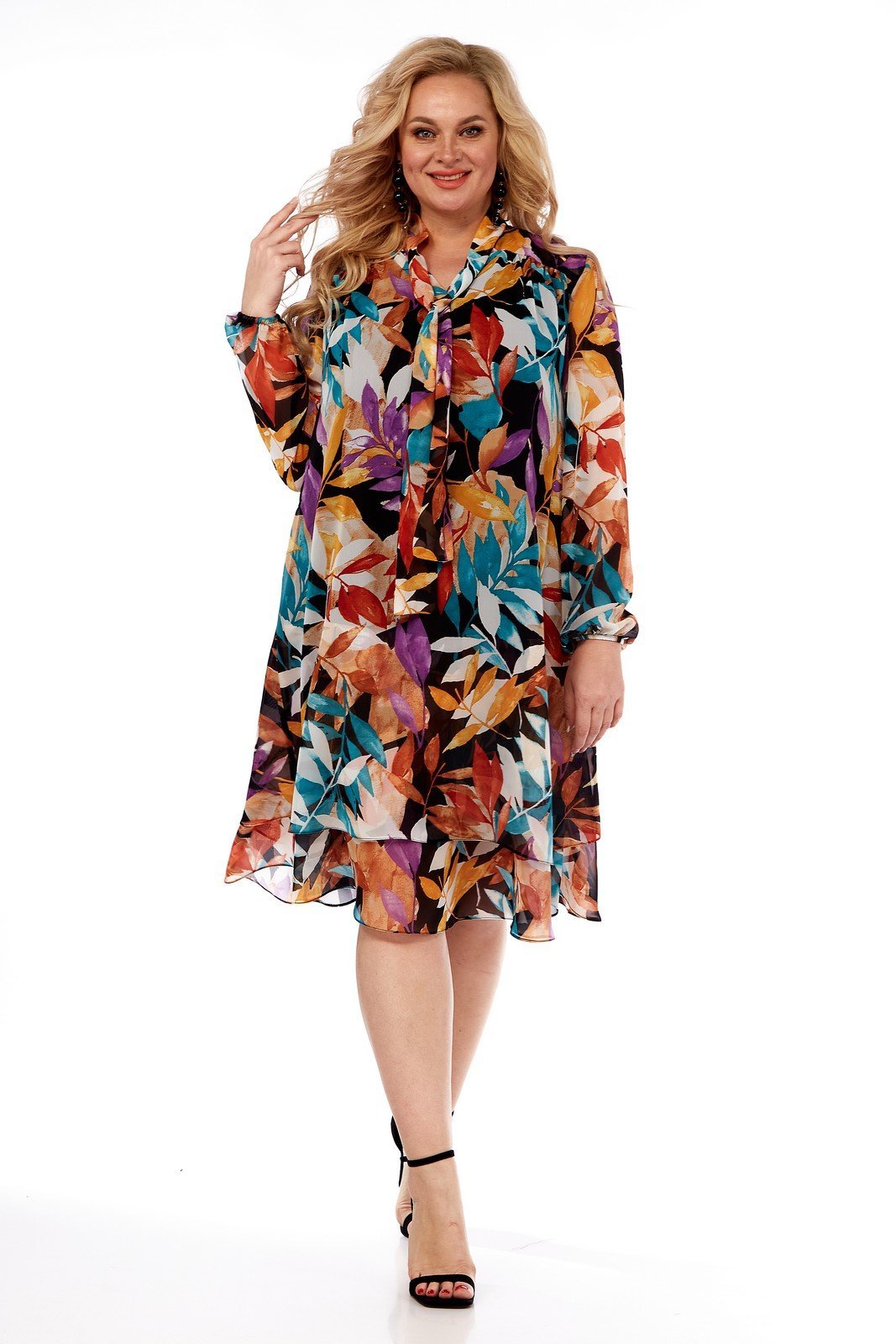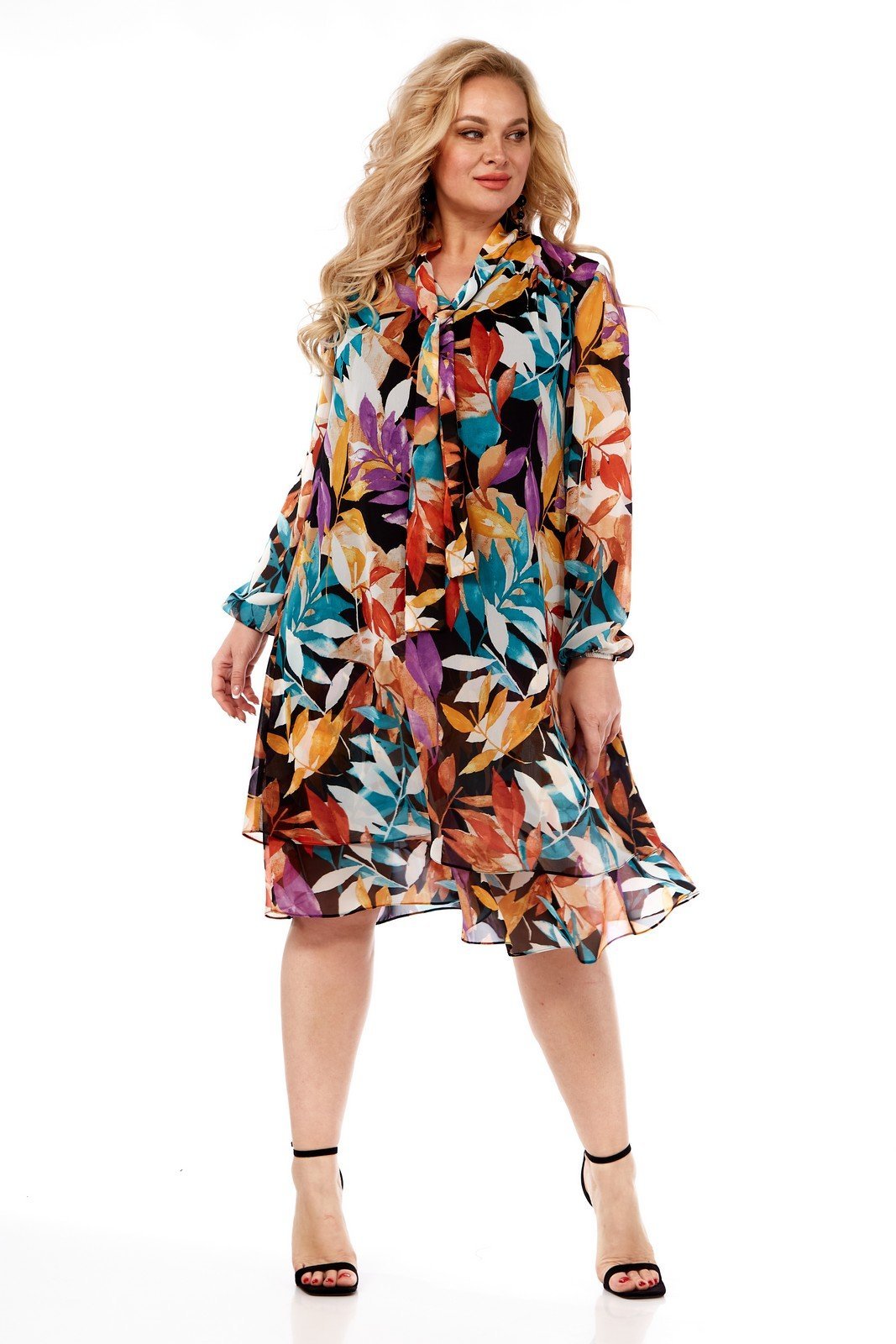 Горловина платья V-образной формы, воротник обработан стойкой, переходящей в бант. По полочке обработана кокетка, спинка цельная. Рукав втачной одношовный, низ рукава на резинке.