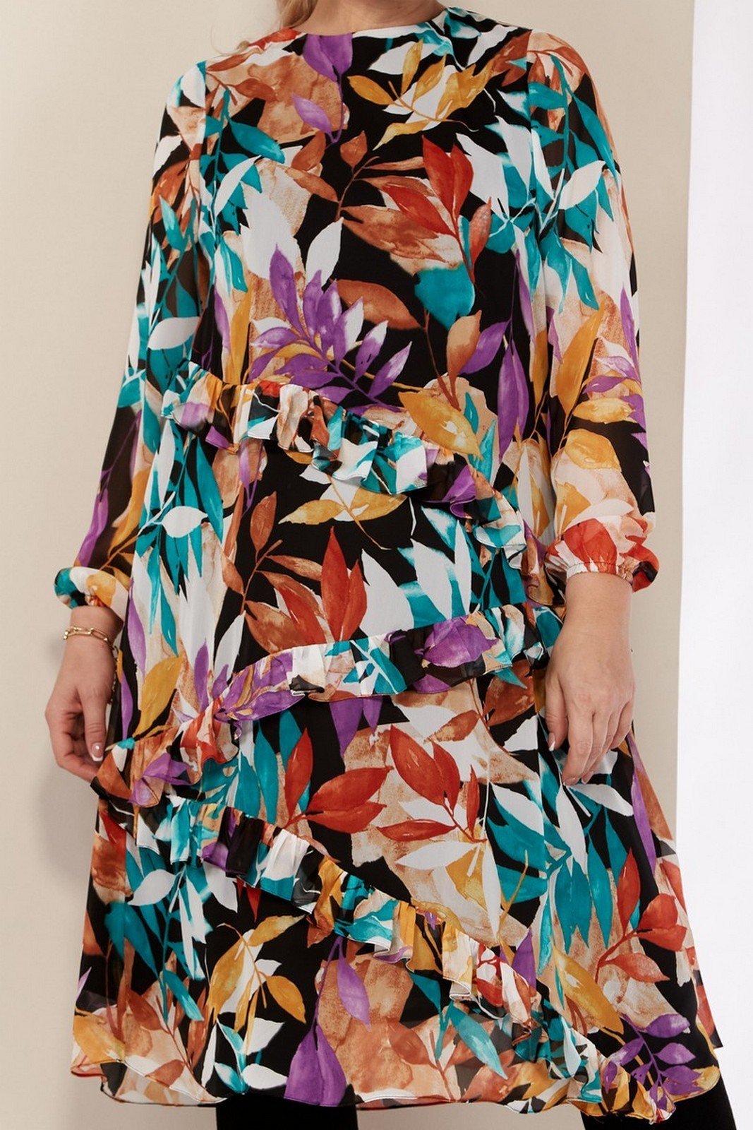 Полочка платья с асимметричными подрезами, в которые вставлены рюши, спинка цельная. Горловина округлая, застежка на навесную петлю и пуговицу на спинке. Рукав одношовный длинный, низ на резинке.