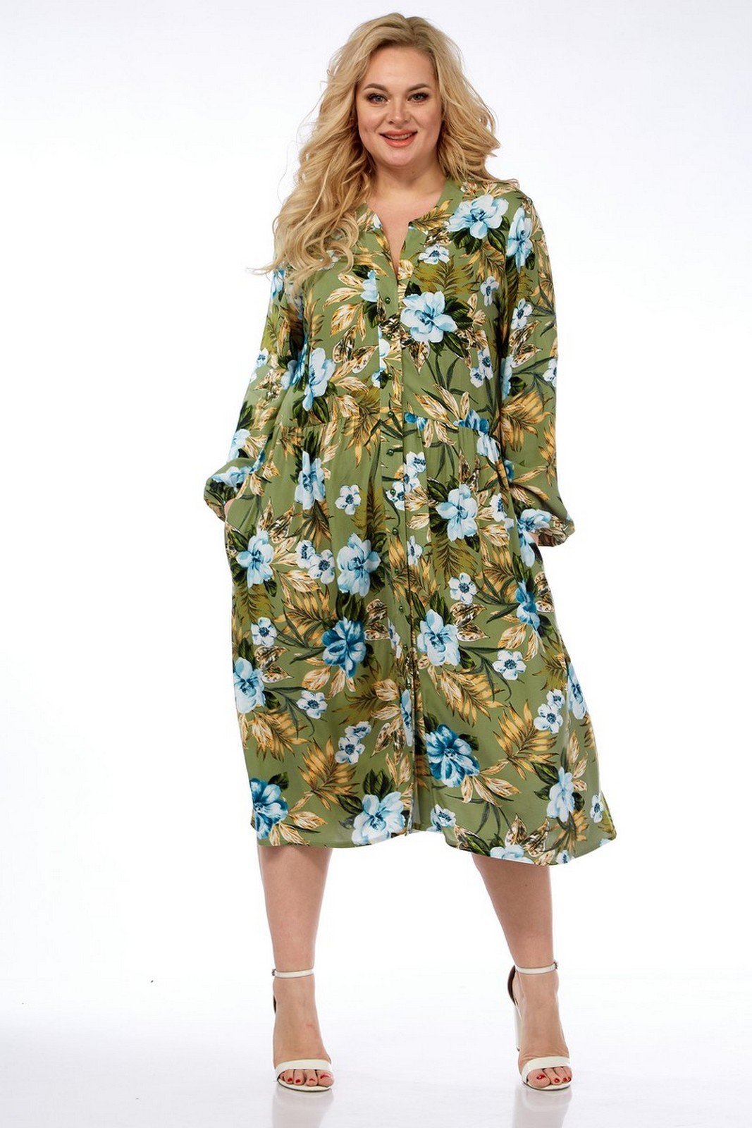 Платье выполнено из мягкой штапельной ткани устойчивой окраски.