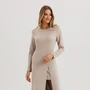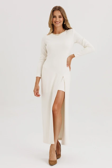 Платье женское длинное прилегающего силуэта, выполнено из трикотажа. Перед с нагрудными вытачками, с фигурным подрезом, с рельефами, от вытачки до подреза, с разрезом от угла подреза, с нижней юбкой выполненной из основного материала. Спинка со средним швом. Рукава втачные одношовные длинные. Вырез горловины округлый.