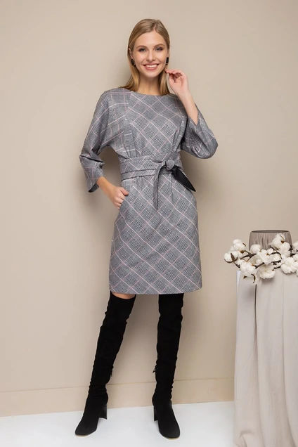 Платье полуприлегающего силуэта из трикотажа в клетку с люрексом. Перед с фигурными рельефами от горловины до бокового шва. Спинка со средним швом, рельефами и шлицей по низу. Горловина - лодочка. Рукав цельнокроенный. Платье дополнено поясом – кушаком и карманами.
