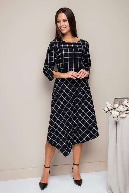 Платье X-образного силуэта из смесовой плательной ткани в клетку, длина midi. Лиф платья облегающий, линия подреза на талии фиксируется тонким ремешком. Юбка с асимметричным низом скроена по косой. Вдоль боковых швов - удобные карманы. Вырез горловины - лодочка. Застежка на потайную молнию - в центральном шве спинки. Рукав 3/4, с небольшим разрезом по низу.