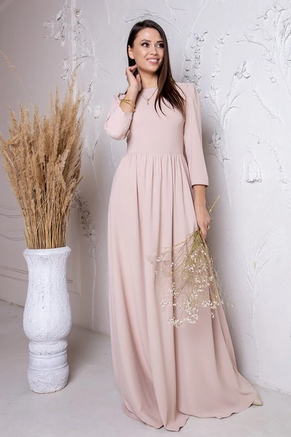 Платье в пол из пластичного легкого материала с подрезом по талии. Лиф приталенный, с вытачками по переду и спинке. Юбка удлиненная, со сборкой. Рукав 3/4, на манжете и сборкой по окату. По переду - вырез горловины и- лодочка. На спинке - глубокий V-образный вырез и застежка на потайную молнию.