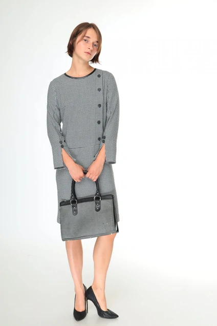 Элегантное платье полуприлегающего силуэта из мягкого эластичного текстильного полотна в трендовом дизайне - «гусиная лапка». Округлая горловина с кантом из эко-кожи, спинка со средним швом и талиевыми вытачками. В среднем шве спинки расположена застежка на длинную потайную молнию, внизу шлица. По переду нагрудные вытачки, с левой стороны планка с имитацией застежки на пуговицы. Линия талии отрезная, чуть занижена, на уровне линии бедра расположены прорезные горизонтальные карманы с листочками из эко-кожи. Рукав втачной длинный с передним швом, внизу глубокий разрез с отделочными пуговицами. Платье без подкладки. Модное универсальное платье весьма гармонично в элегантном образе современной леди.
