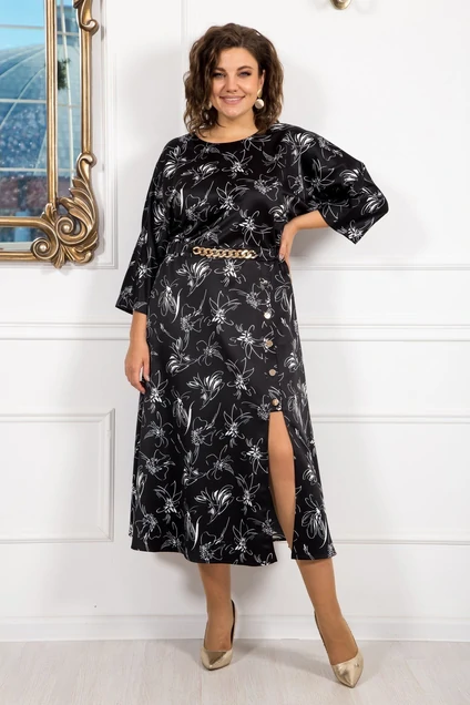 Идеальное платье для торжественных мероприятий и романтических прогулок. Платье в длине миди из качественной плательной ткани с вискозой в составе. Горловина округлая с внутренней обтачкой и отделочной строчкой, по спинке глубокий разрез и застежка на навесную петлю и пуговицу. Крой рукава «кимано» делает платье очень привлекательным, рукав свободный. Платье отрезное по линии талии, частично на эластичной резинке шириной 3 см, по переду выполнен притачной пояс с декоративным элементом в виде цепочки, которую при необходимости можно снять. Декоративные элементы изящно подчеркивают линию талии, позволяя одновременно чувствовать себя комфортно и удобно. Нижняя часть платья в виде расклешенной юбки, легкой и струящейся. По переду юбки с левой стороны расположены притачные планки с отделочными строчками и застежкой на петли пуговицы. Длина застежки до колена, к низу платье с эффектным глубоким разрезом. Элегантное и летящее, оно обеспечит восторженные взгляды.