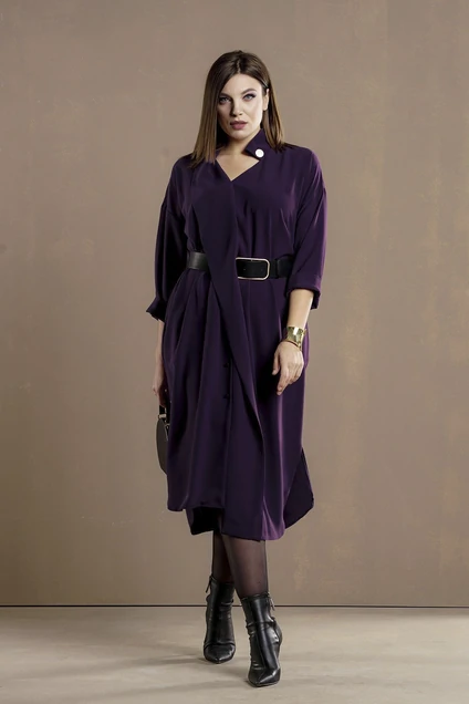 Стильное платье женское свободного силуэта с карманами в боковых швах и ассиметричным низом. Вырез горловины оформлен отложным воротником переходящим в декоративную планку.Рукава отрезные на базе цельнокраеных. В боковых швах- разрезы. Длина спинки-120 см. Длина рукава от линии горловины- 63 см. Изделие дополнено съемным поясом.