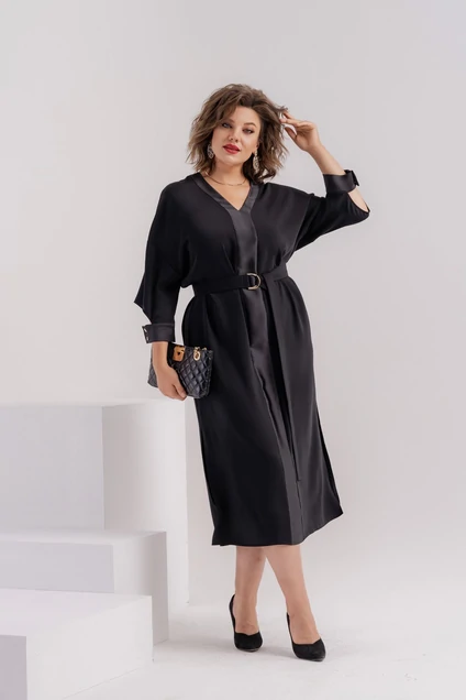 Платье женское свободного покроя с V-образным вырезом. Рукава отрезные на базе цельнокроеных, по низу фигурный вырез и манжета из отделочной ткани.В боковых швах разрезы. По центру переда вставка из атласной отделочной ткани. Изделие дополнено съемным поясом из основной ткани на полукольцах.