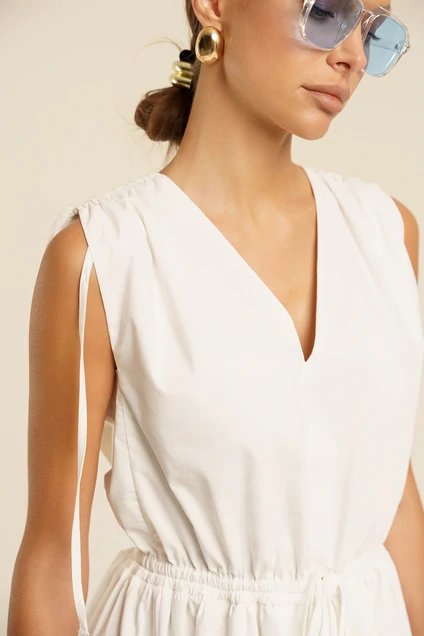 Платье женское приталенного силуэта из хлопковой ткани. Вырез горловины углубленный V-образной формы. Ширина линии плеч регулируется завязками. По линии талии также имеется функциональная кулиса, позволяющая регулировать длину обхвата талии. Низ платья расширен к низу. В вертикальных подрезах по переду имеются карманы в швах. Изделие декорировано авторской вышивкой.